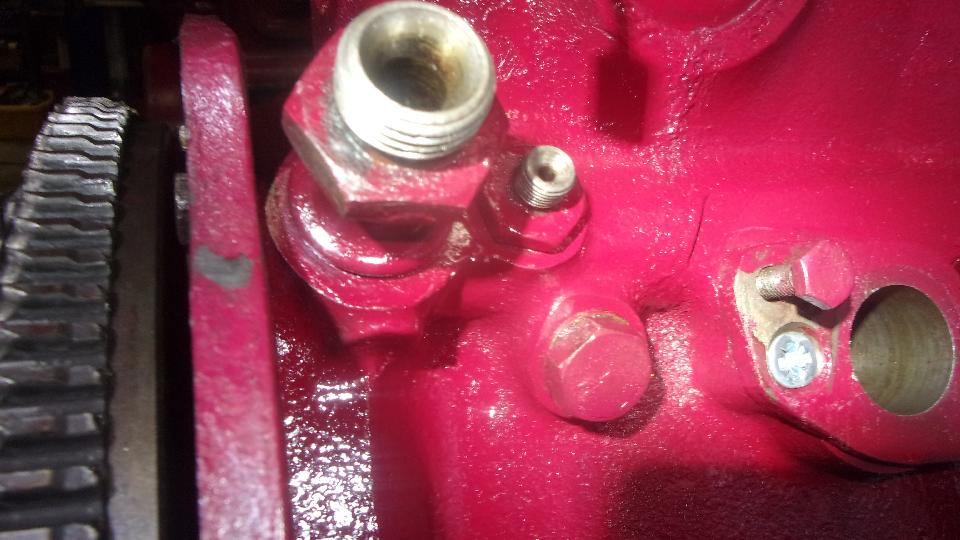 Pull a new grounding strap out of the Magic Trailer so we can leave one on the loaner engine for future convenience. Snatch my well used oil filter adapter from th loaner engine, planning on doing a hanging spin-on adapter for that one later. Snatch the hex head plug from the other engine because no spare. The story there is when I install a magnetic oil drain plug, the oil plug moves to left side of block for the oil cross port (above the pressure relief valve), and the hex head plug with copper washer from there moves to right side of block to plug the water jacket drain port (because this plug has the required shorter thread). All BSPS threads (British Standard Pipe Straight threads with copper washers), fun, huh?