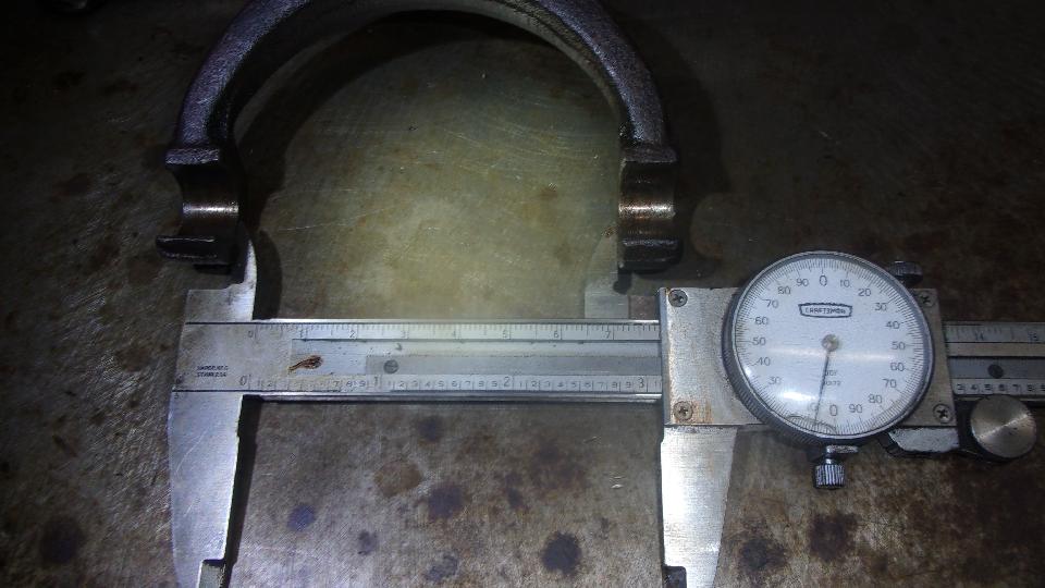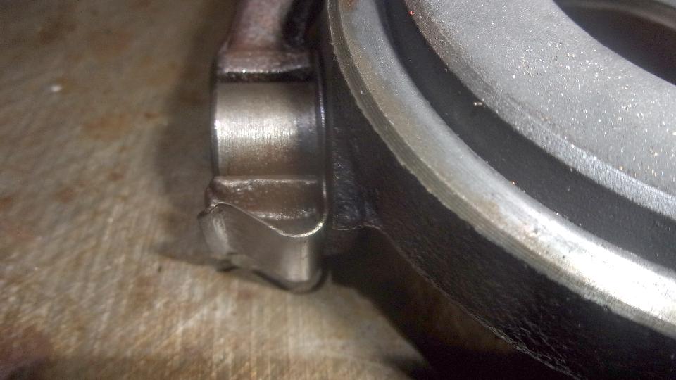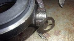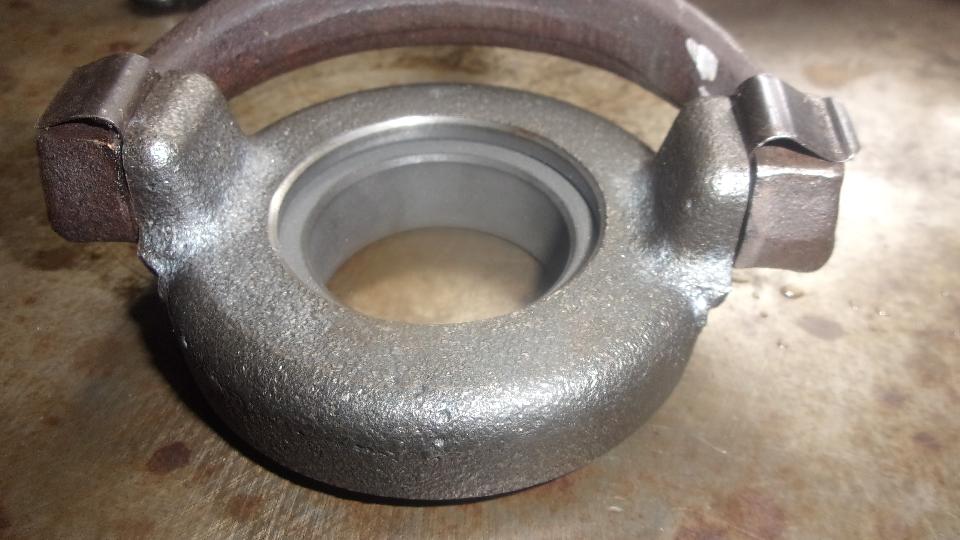 Good morning. Well, it was noon by the time we got started today, but on with the show. After sleeping on the problem, I have decided to do something that is generally against my morals, and bastardize a perfectly good original clutch release arm in order to use a faulty replacement part. There is a lathe available here, so I could re-machine the new release bearing to make it right, but time is precious, and it is going to be easier and quicker to hand grind the inside surface of the release arm. Measurements are like this: