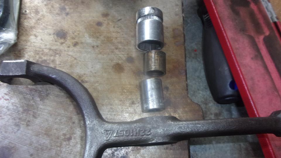 Pushing our the old worn bushing, using two standard wrench sockets. The bushing drops inside of the larger socket, while the smaller socket OD is slightly smaller than the bushing OD. Align carefully in a vice, and given a gentle squeeze it slides right out.