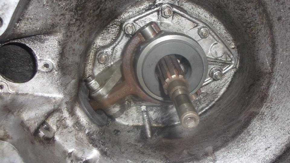If this is the first time installing an MGB release arm in an MGA gearbox (with MGB front cover), then you would need to grind the side slot in the bellhousing a little bit for the square end of the arm to pass through. Rounding off the square corners of the arm reduces amount of grinding required (photo center above).