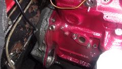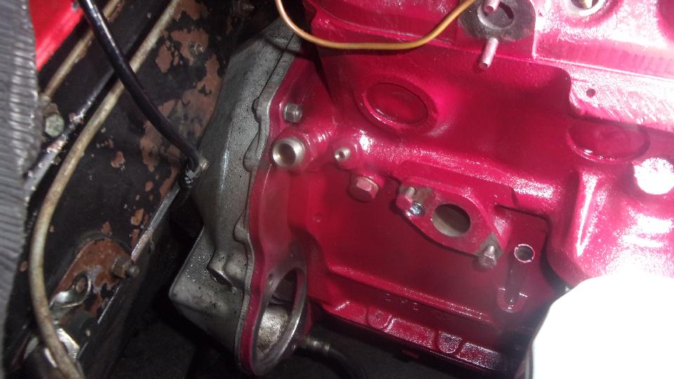That was when it dawned on me that the low starter position in the rear plate may be a little bit too low and too close to the block. We picked up an original MGA starter motor, and it did fit, but very close to the block (almost touching). Then picked up my little gear reduction starter, and that was not going to fit that close to the block without more modification to the flange on the GR starter. instant decision, this rear plate will have to be changed when the loaner engine comes out of the car. Painted sides of the block near the front, and inboard sides of engine mount brackets before the front plate was installed (to avoid R&R of the engine mount brackets from the front plate).