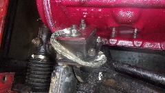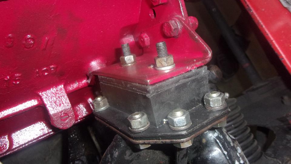 The next three pictures represent a three hour fight. Remember the engine mount spacer plate I showed you early Sunday, just before we pulled the loaner engine out of the car? I was determined to install two of those, one on each side, to raise the engine so the stating handle (hand crank) would fit in above the steering rack, as it did originally from the factory. I suspect replacement engine mouts have been thinner than original spec for the past several years (maybe farther back). With seven bolts in, the bottom one on left side would not go, not even close. Bottom bolt firse, and at least one of the others would not go. Had to take both sides apart and start with the left side, finish on the right side. Lesson here is to always install the bottom bolt first. Two engine mounts usually take 20 to 30 minutes, could be just a little longer with one spacer plate, but two plates is a killer.