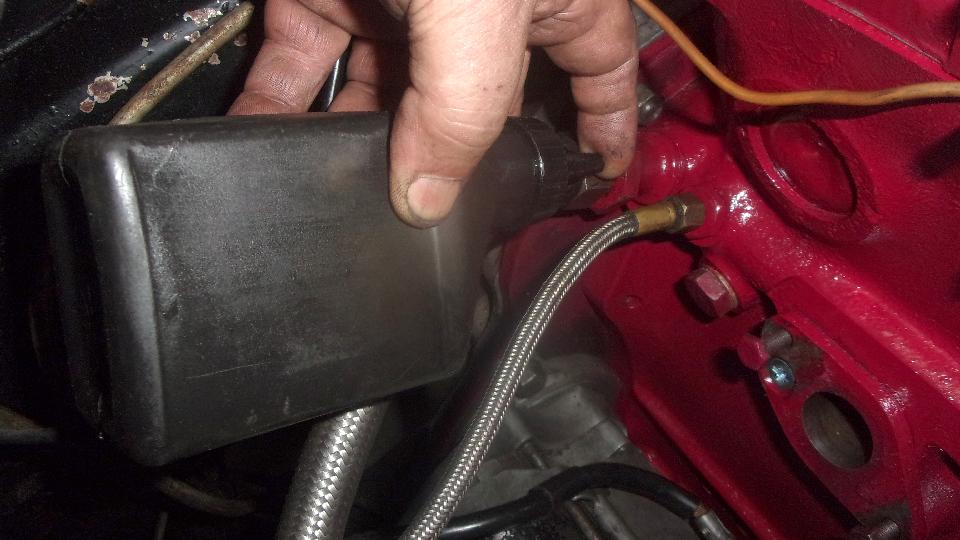 Slept in, and catching up some clerical work, so work start was mid day. Need to finish dressing the engine and get some oil into it. Going to reverse feed to prime the oil pump first, just to be sure it will prime and pump on first crank-over. The small black squeeze bottle holds 6-1/2 Fl-Oz, and we keep it around primarily for filling shock absorbers. Today it be injecting oil into the port at right rear of the engine to back fill the oil pump. The oil pump displaces 1/2 Cu-In or 0.9 Fl-Oz per turn, which is two turns of the crankshaft. Do the, and we turned the crankshaft backward 14 turns to suck in that bottle of oil. Turning forward then immediately pushes oil out of the port to prove it is well primed.