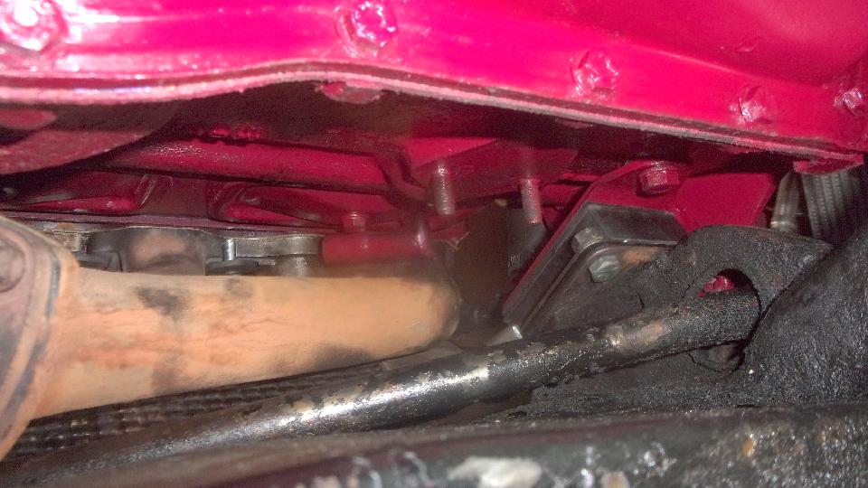 Finally time for the engine. Jack the gearbox up tight against top of tunnel, and tilt the engine back some. With the standard sheet metal crankshaft pulley it is a close pass, may scratch a bit of paint off of the steering rack, but it always works for me. If your engine has a harmonic balancer, no way, and you will have to remove that to clear the rack. (Excuse the ghost in that picture, might be a hair on the camera lens).