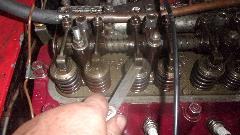 We finally got to work assembling the head well after sun down (maybe 10-pm). Just one picture before we got too busy to pick the camera up again. Needed to lap the valves first, then clean it to remove all lapping compound. Something caught my attention, maybe didn't look right when lapping in the new exhaust valves, so I measured the valve heads (intake and exhaust) and wrote down the numbers for reference. Oil it up and install all the valve gear, then flip it top down level to fill the combustion chambers with water to assure no valves were leaking into the ports. Don't recall why that took so long, aside from the fact that navigator had his nose into everything (not all bad) including extra hands on the spring compressor while installing valve O-ring seals and spring caps and cotters. Seems like I didn't install umbrella seals this time, but that's okay because the factory never used them, even after the splash shields were deleted. We will see how this 18 head does in original mid-production MGB configuration.