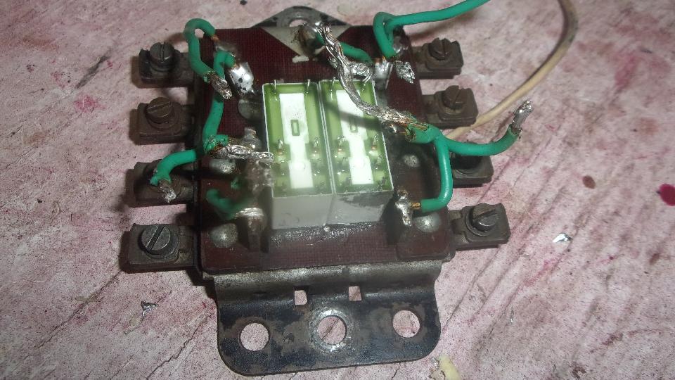 Eight quick fork lug wire terminals and two hex nuts removed from my custom captive studs, and it is out of the car in minutes. Sitting with a temperature controlled soldering iron, not long to un-solder the wires from the relays. They were mounted with double sided foam tape last time, so just a little pry with a screwdriver and they were out. None of that handy here, so this time I used super glue (and hope it will come apart next time). Takes little longer to solder all the wires back on the pins, but it is soon back in the car with turn signals working again.