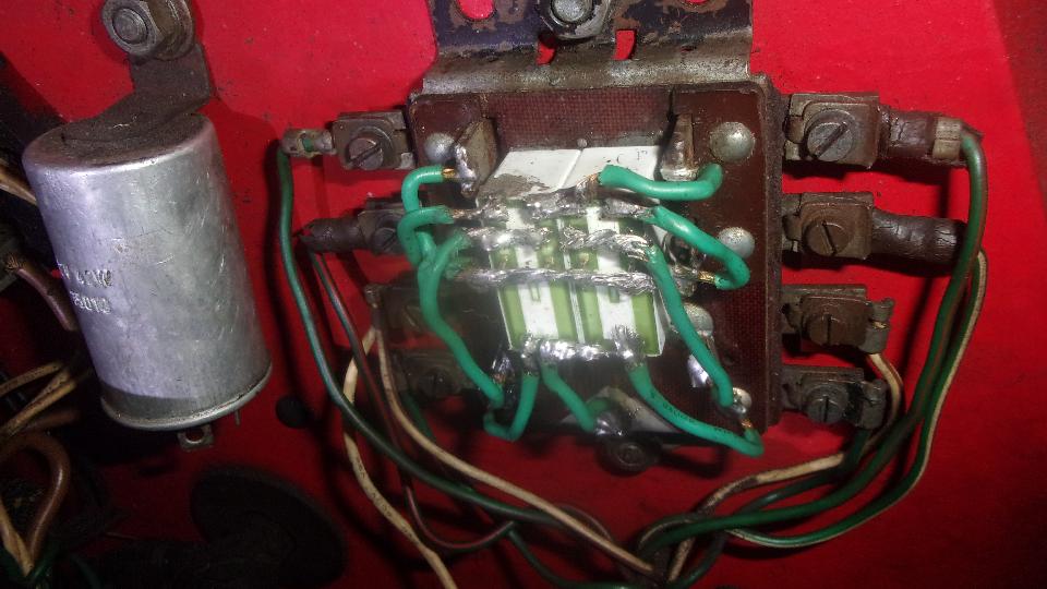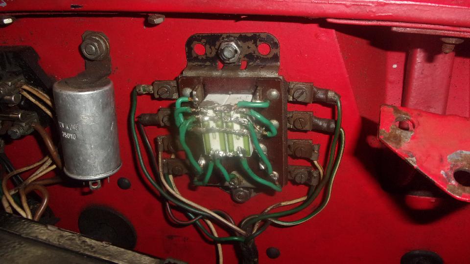 Then we got another shot at the turn signal relay. After replacing the relays and re-soldering all the wires, it was working well for five days, then went wacky yesterday. It was bewitched, doing various strange tricks, like flashing the brake lights when everything we switched off, and allowing one turn signal either left or right to work or not work, and brake lights would not work when the rear lights were flashing. We unplugged the flasher unit as a quick fix so we could drive it to the shop today (just no turn signals).