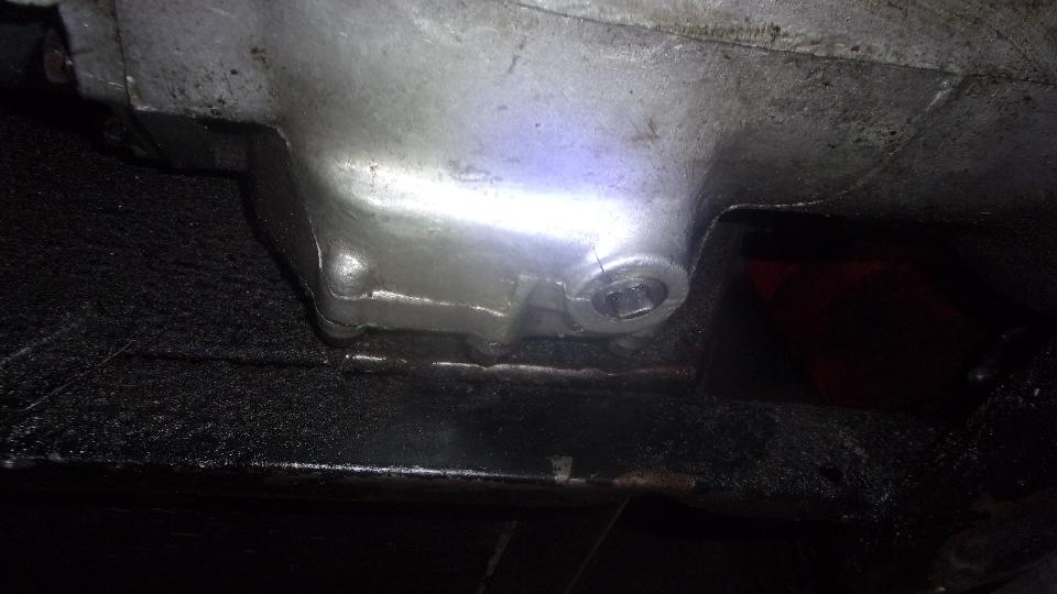 Closed up with the two alignment bolts in place. The bolt you see near the oil outlet port (upper right of engine) and the one 180 degrees opposite (lower left of engine) fit into slightly smaller clearance holes in the engine back plate and gearbox bellhousing. Put those two in first, and you can tighten them right down, and then the rest of the bolts will fly right through with no fuss.