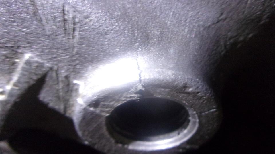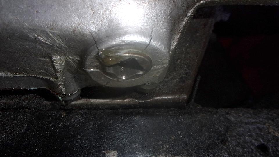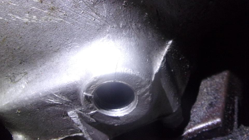The gearbox had been draining for hours and was no longer dripping. A paper towel on my pinky finger could just reach inside one knuckle's worth to wipe out oil and sediment inside. Then we used a soldering acid brush with the end bent to reach in to brush it with copious amounts of lacquer thinner, literally clean enough to paint (and dry of course). There were two very visible cracks radiating from the port, making it clear where and how it could leak an ounce a day. Scratch head how to fix.