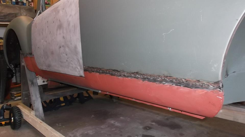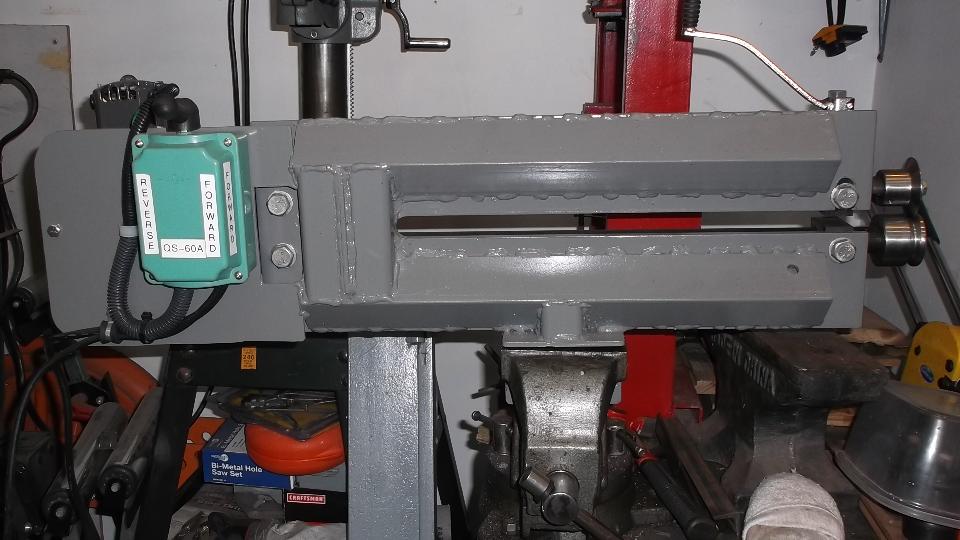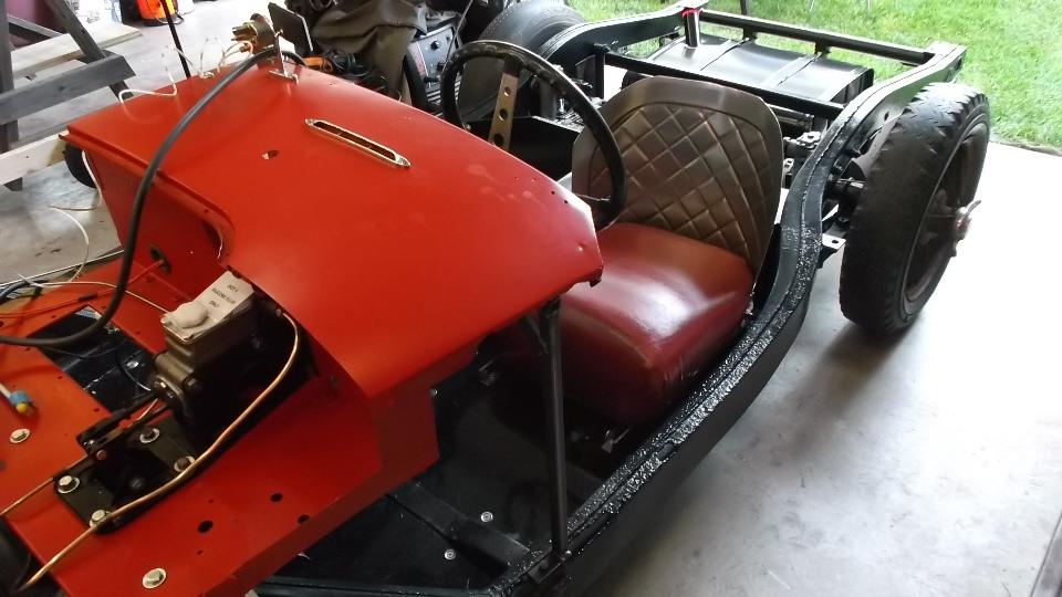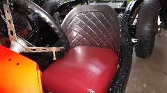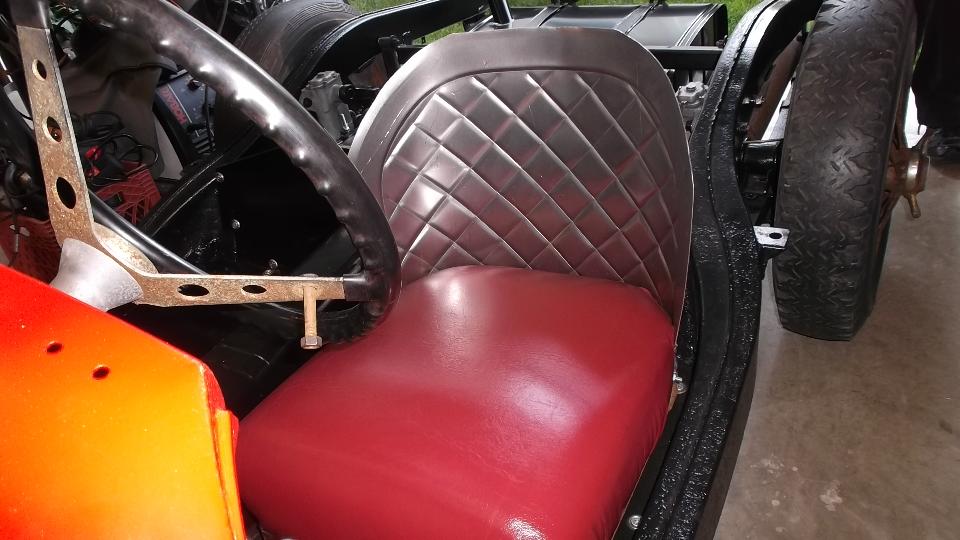 Bob has a nice bead roller. This started life as a cheap hand cranked unit from Harbor Freight, but it was too flexible for any heavy gauge work. He welded on some angle iron for stiffening and added a power drive motor with gear reducer and foot control switch. Nice piece of work. The racing seat was an interesting practice piece.