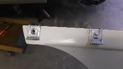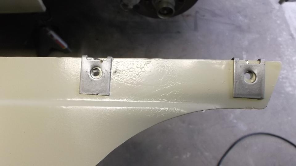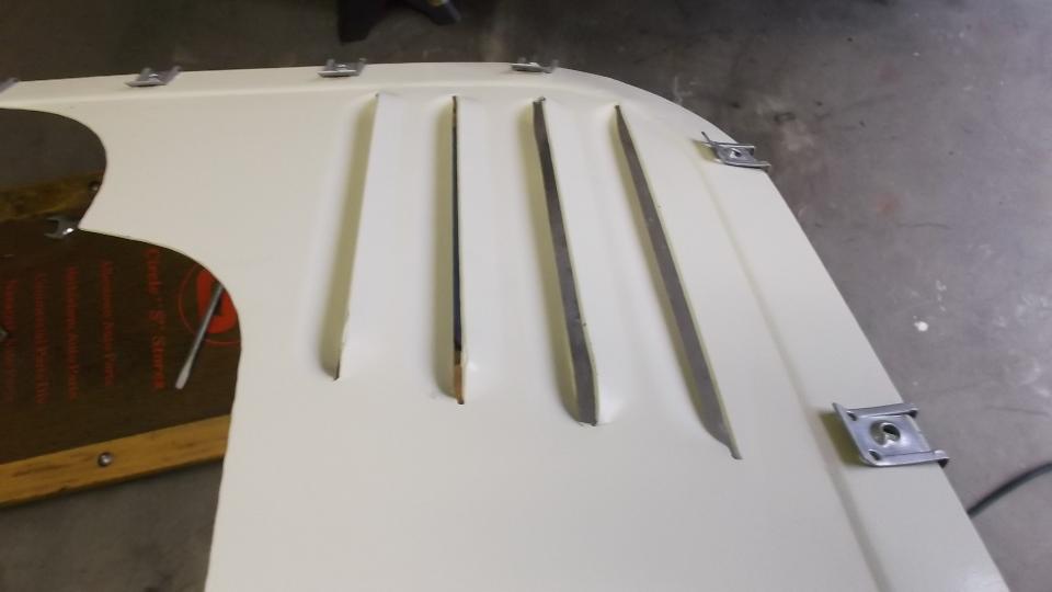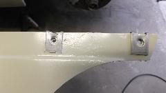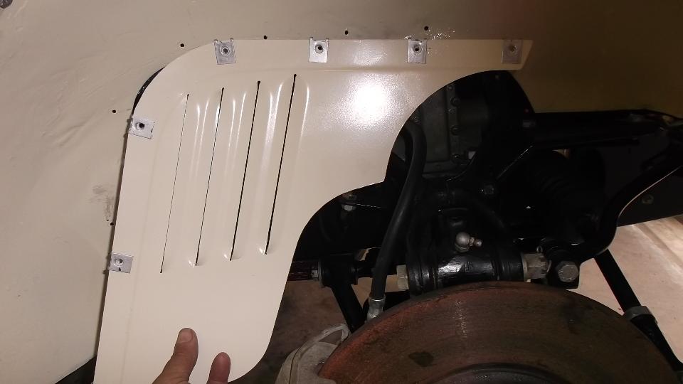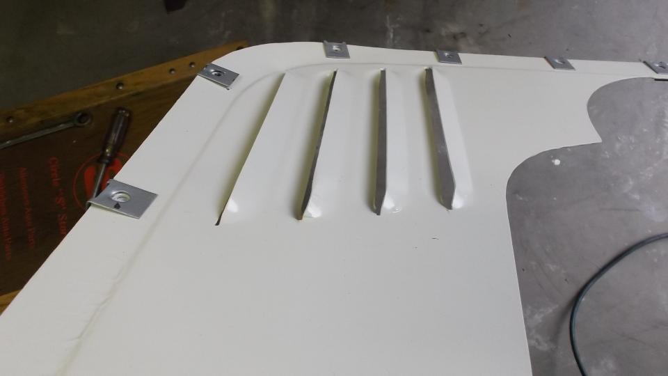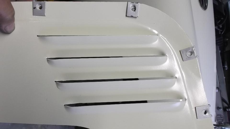 Original style louvering for the Twin Cam Inner fender removable panels. Notice the double louvering with raised louvers on both sides of the panel. There is also a narrow slot punched between the facing louvers before forming, and a small keyhole at ends of the slots. This eliminates a sharp slit at ends of slots to make painting easier. Zinc plated Tinnerman fasteners are installed on the removable panel after painting.