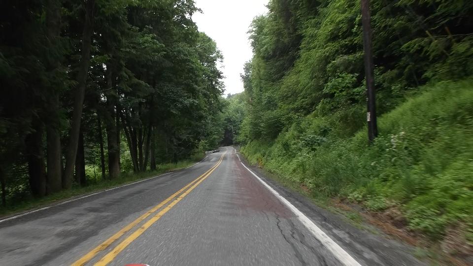 Spent the day cruising casually around the Catskills (Catskill Park, NY). Roads are narrow, hilly, winding through the forest, sometimes a little rough or slow, and generally delightful. Rain in morning, stopped raining remaining overcast for most of the run in the forest, and resuming rain as we returned to "civilization". Returned to Clifton Park on US-9 just north of Albany, NY for the night.