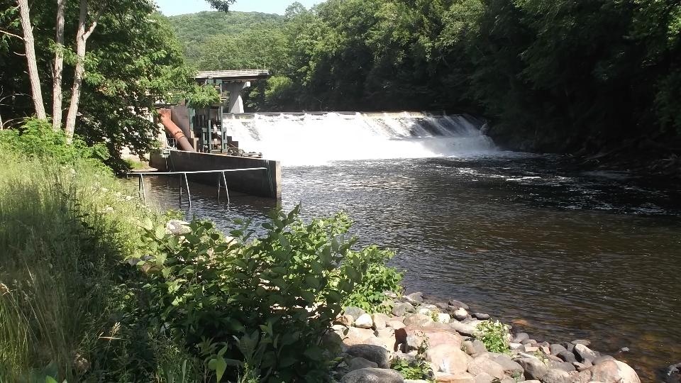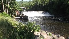 Referred to as a "waterfall" in the tour instructions, this dam (picture at right) appears to be configured as a water power source for a mill. The structure on left in the picture looks like a dock for a small barge. The river below the dam is (or was) dredged to allow passage of a barge up the river to the dock.