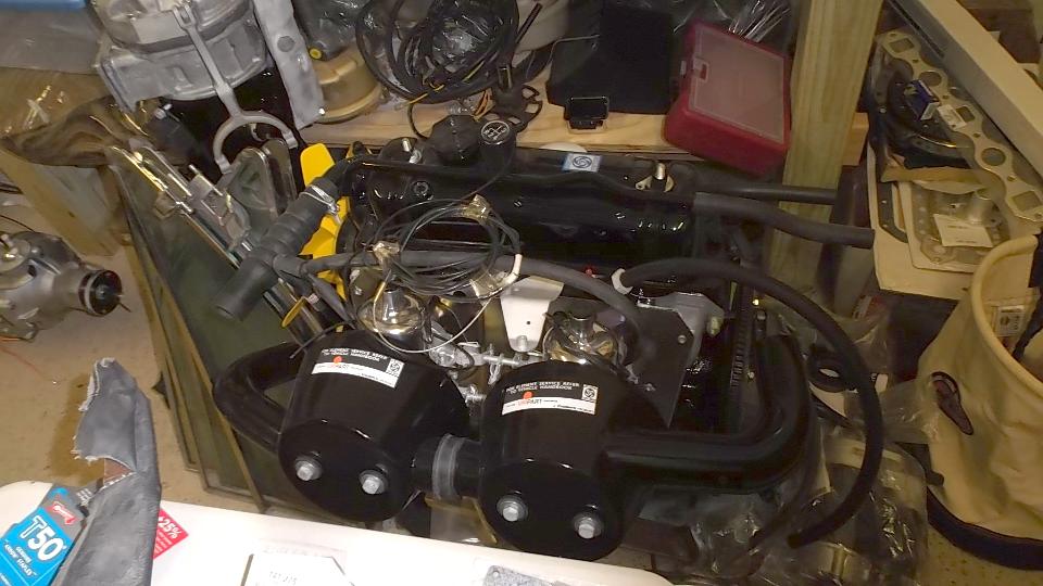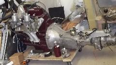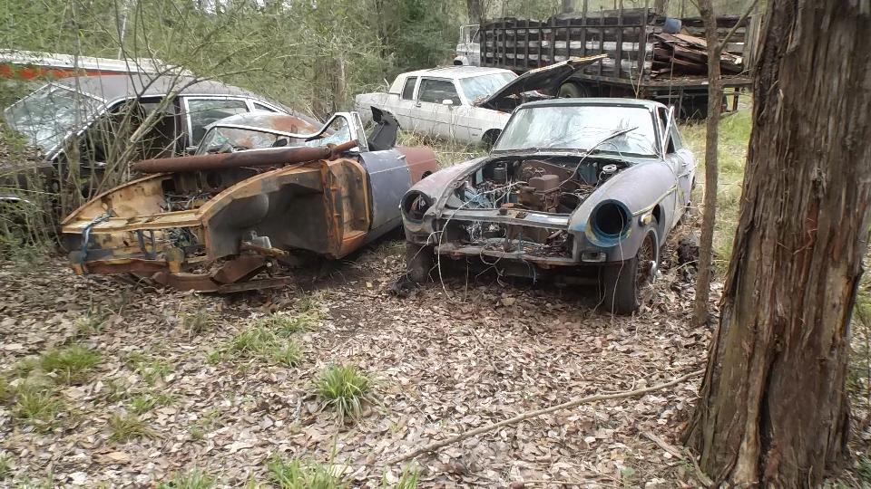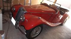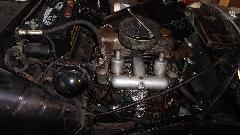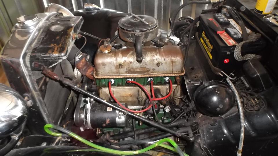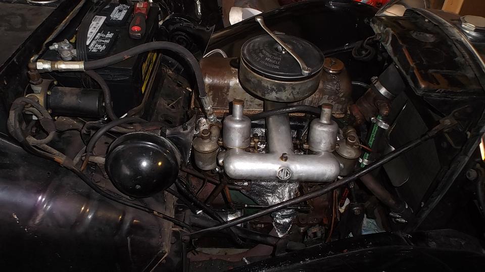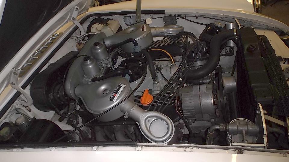 I think this is a MG TC in restoration. Next is an MGB engine with overdrive gearbox almost ready for installation. Last is a European specification late model MGB engine with dual carburetors and air cleaners to clear the brake booster (very slick and seldom seen in America).