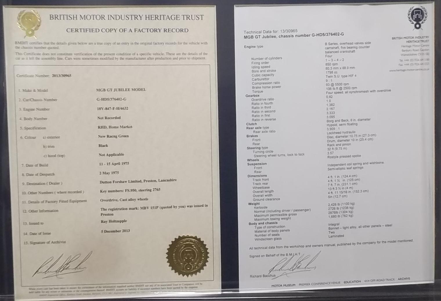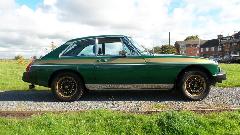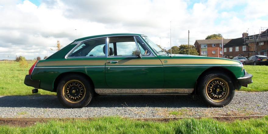 Today I paid a visit to Ray Holtzapple and his MG Shop in Houston. The first car to see was a 1975 MGB GT Golden Jubilee special. Only a small number of these cars were produced to celebrate the 50th anniversary of MG cars, and there may be only three of these in the USA. When the restoration is finished it should look like the photo below center. They were all British Racing Green with wide gold stripes, alloy wheels, and special badging. He has the Heritage information sheets to show this one is real.