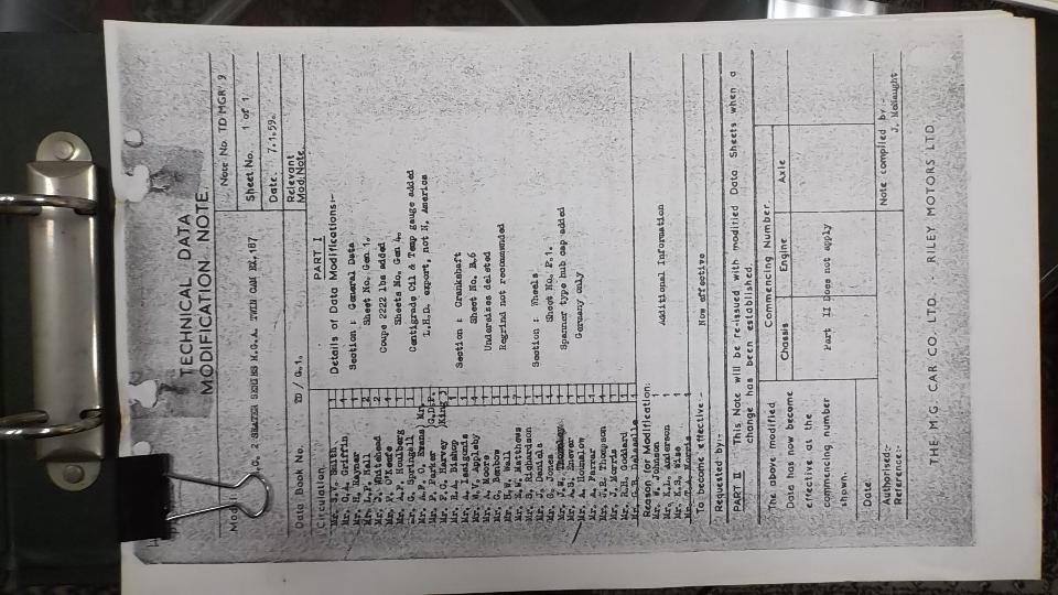 While I was chatting with Ray he started pulling out some original documentation for MGA cars, including an original factory copy of the Engineering Technical Data for EX-187. This is the project that spawned the production MGA Twin Cam and all of its changes and updates during production. At one time he loaned the documents to MG Car Club (England) so they could reproduce it, then never got it back. But he does have a copy of it and the original cover. It is not for my immediate consumption, but he promises to scan it so it may be published on my web site.