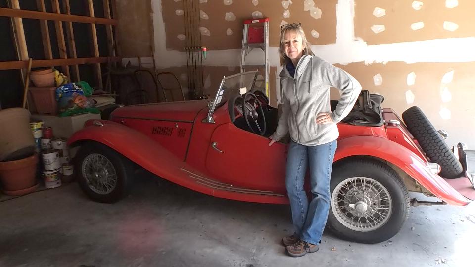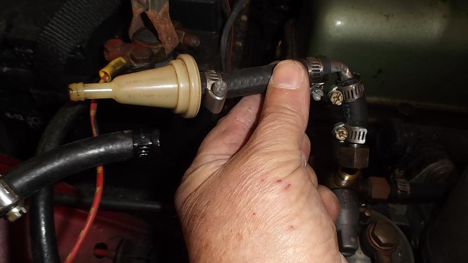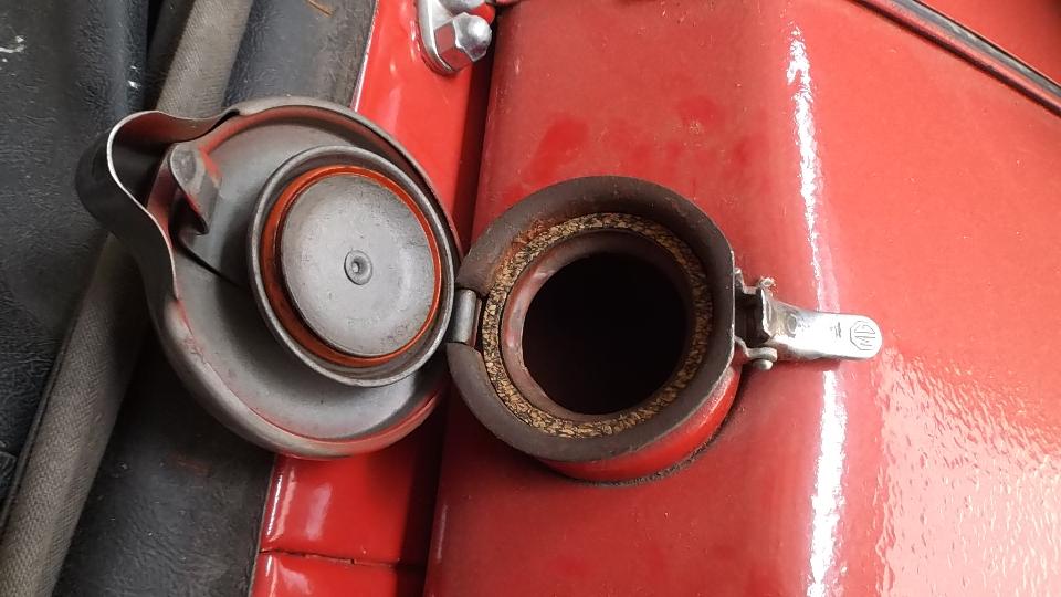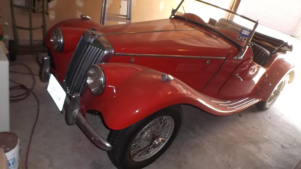 Today I had an appointment with Karen Hallett in Houston TX to do a bit of work in her 1954 MG TF (which ran when parked). The battery was pretty dead on arrival, but a charger was handy and brought it back to serviceable condition in short order. It cranked well, but didn't start. Good spark from the coil, decent spark at all four plug wires, no fuel in the tank (but the tank is very clean inside). So we transfer a gallon of fresh fuel from my MGA to the TF. In the process the fuel filler cap got a new cork seal (which came from my magic trailer).