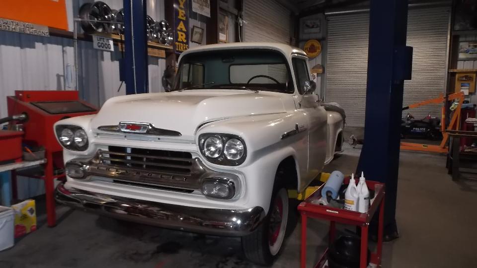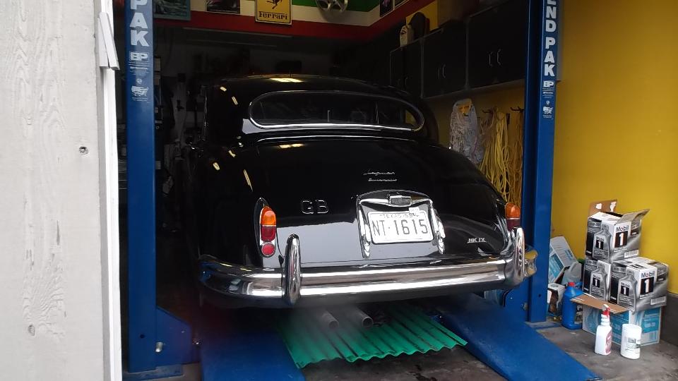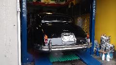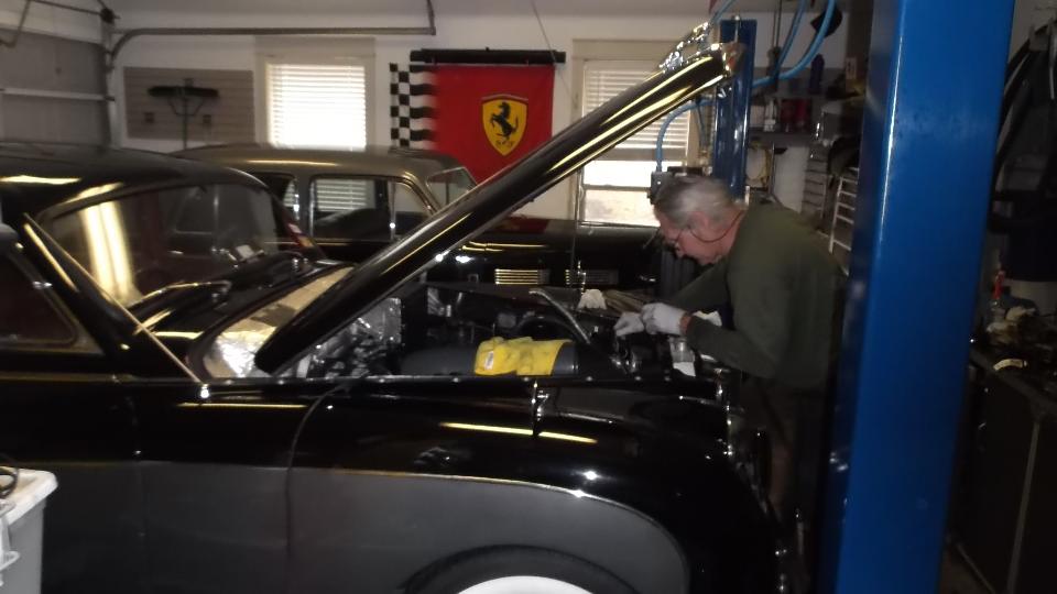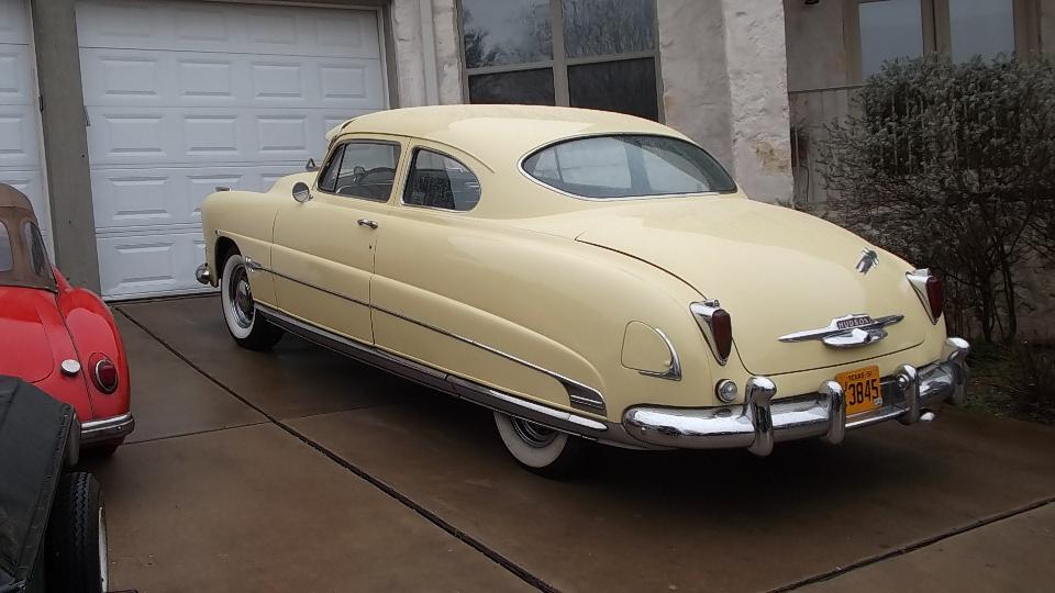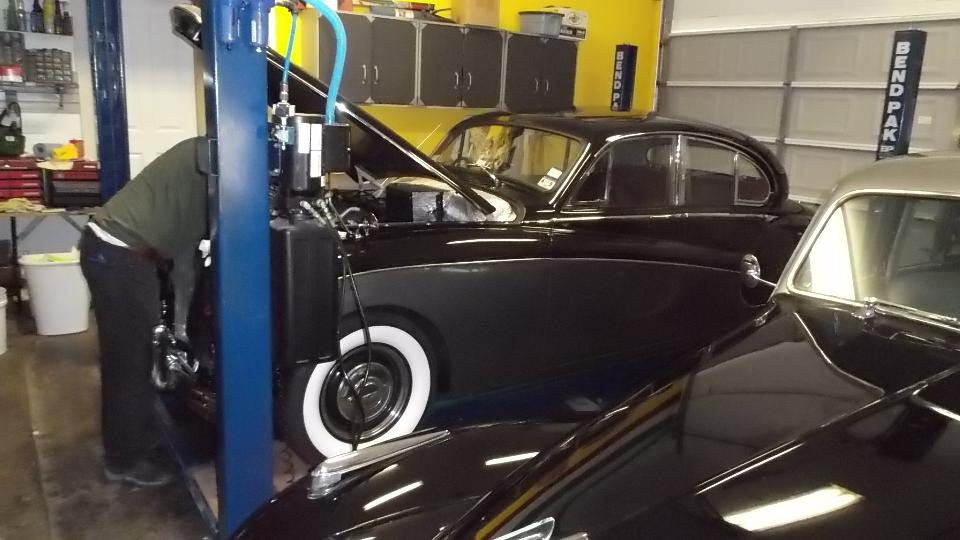 Cruising on west through Austin we finally arrived in Dripping Springs TX for our next appointment with Phil Auldridge who runs Austin Classic Limo. We parked next to the Hudson Hornet. My father owned one when I was young, but this is the first on I have seen as a 2-door Coupe. Inside we find the Cadillac, which I think may be the Super 8 (definitely with a V8 engine). There is also the big Jaguar which just got an alternator transplant (with power steering pump behind the alternator) and is having the AC compressor re-mounted.