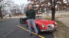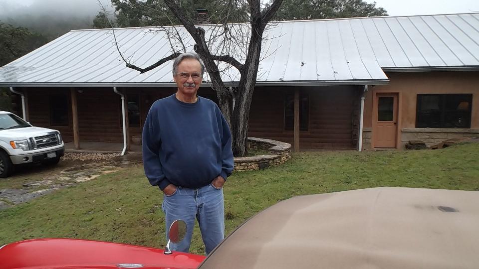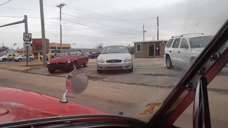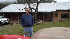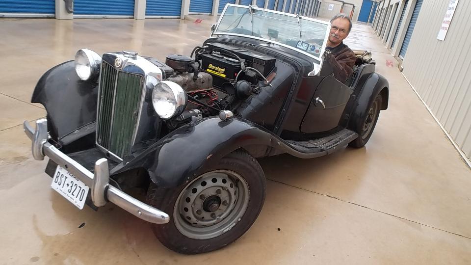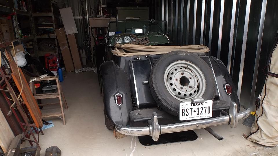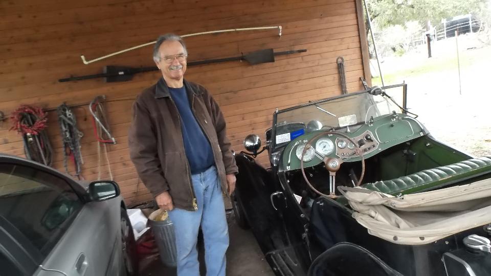 Weather was sprinkling a bit on and off, so Phil was hesitant to take it for a test drive. I managed to encourage him to at least take one lap around the storage lot. So he backed it out and I hopped in for a ride. About 100 feet into the test run Phil's eyes lit up with a grin and he said, "Want to take it home so Jane can see it"? Sure, why not. So we did. This was kind of like grins and giggles and old home week, getting the top-down scenic tour of the local Texas hills. On arrival home Phil parked the TD under the shed roof while Jane popped out for more grins and giggles. Then Phil decided to leave it here so he could work on it and drive it more now that it was running well, so we took his truck back to the locker to retrieve my MGA.