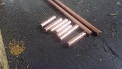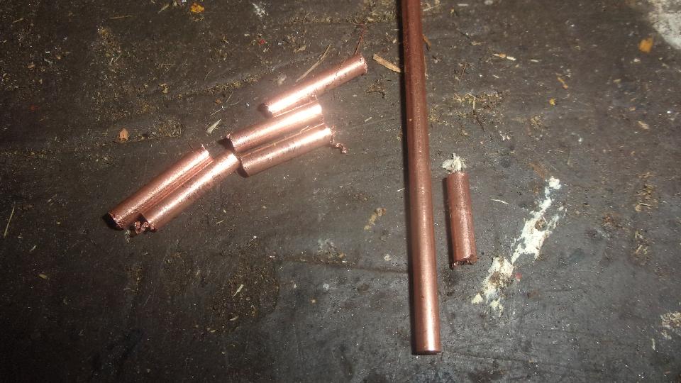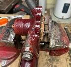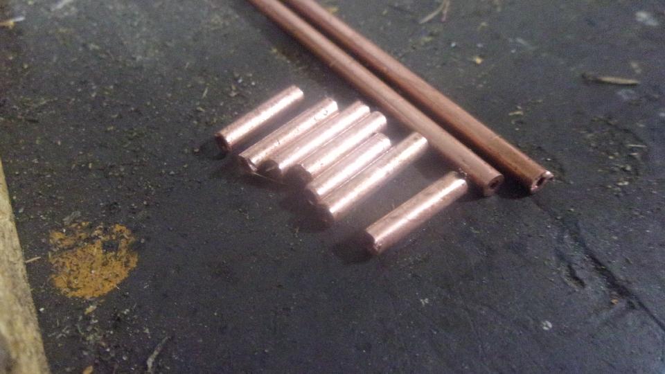 The little chore here was to make a few solder couplings to repair the analog temperature gauges. The original gauge in the MGA has 0.072" OD pressure tube, while a repair tube from a new (cheap) gauge has 0.060" OD. Starting with 1/8-inch copper tubing with 1/16-inch bore, I want to make short coupling pieces with 0.075" drill x 1/4" deep in one end, and 0.0625" through clearance hole. Start by cutting off some short pieces with a fine tooth band saw.