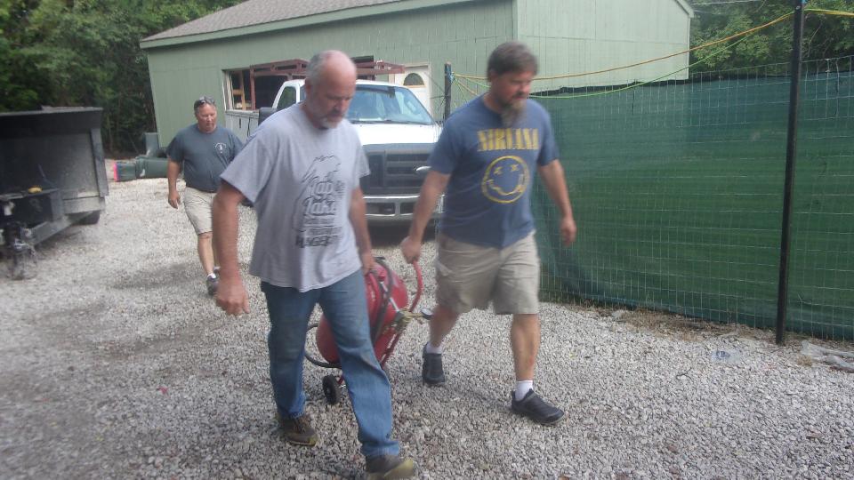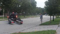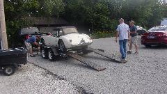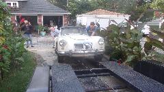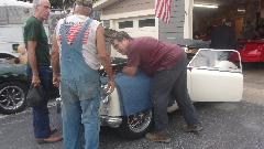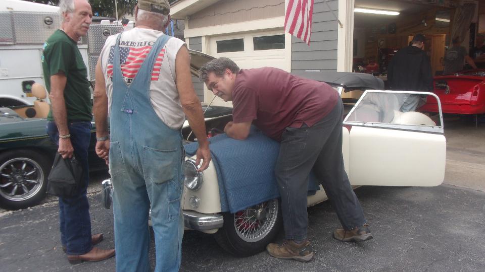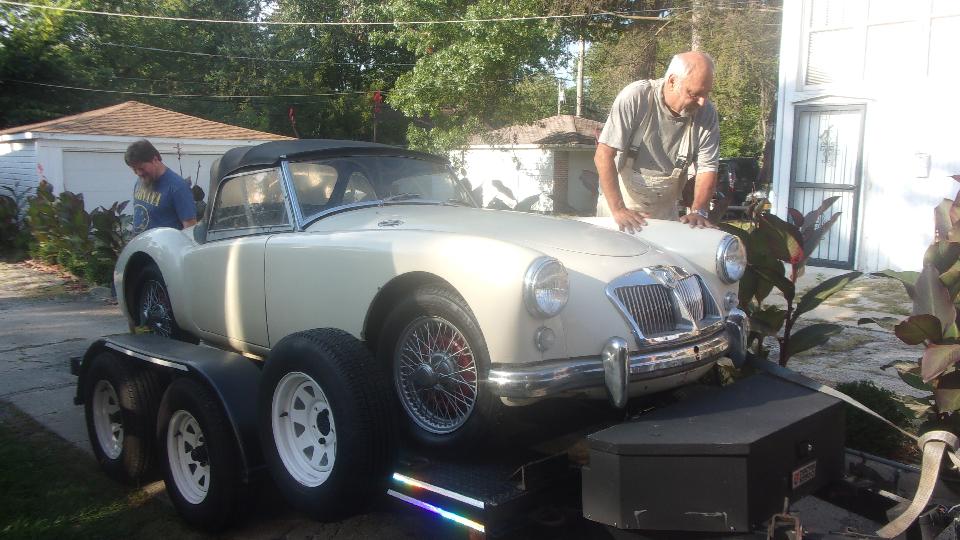 While he was asking, "What's going on here?" we were dropping his MGA off the jack stands and loading it onto the trailer. He was almost in tears when we told him he ain't mothballing this car, we're taking it over to Tom's place so the Wednesday Night Garage Club can make it a Fall project and put it back on the road. That's Sparky in the bib overalls helping to push, after he figured it out. At least he wasn't calling the police.