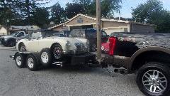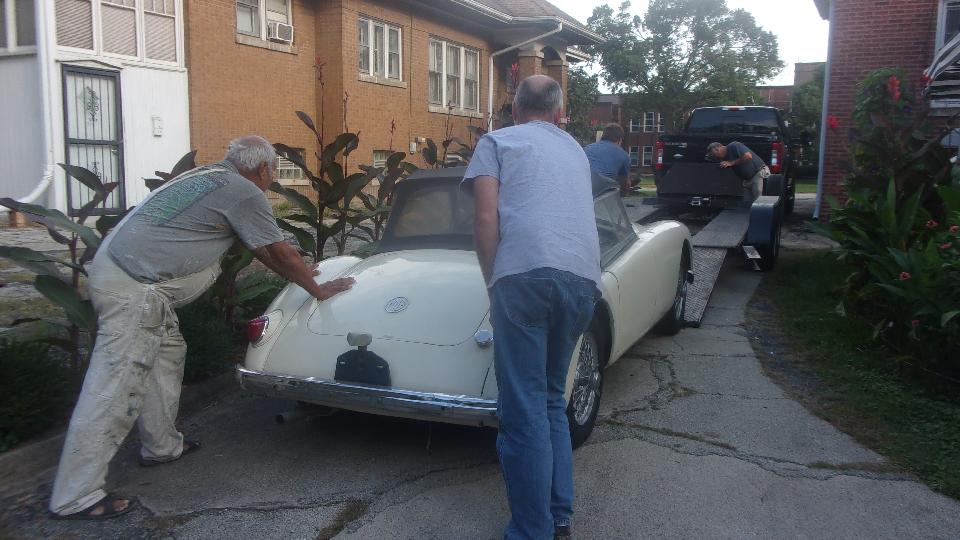 Time for that Saturday morning hanky panky. 8-am hook up the trailer at Tommy's garage and head over to Steve (Sparky) Sparks place in Riverside, IL. Sparky has a MG Midget that we lent a hand with several times in recent years, now running well (most of the time). He recently purchased an MGA that should be a decent driver car once it is running, but seems to have him a bit baffled. He has been asking for advice on mothballing the car, but we have different plans. We are going to steal his car today. Well, maybe not a legal steal, as his significant other is conspiring to help us sneak it out of his garage (and she keeps a pretty good secret). When we showed up at his house we were half expecting silk pajamas and bunny slippers, but he was already up and around.