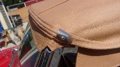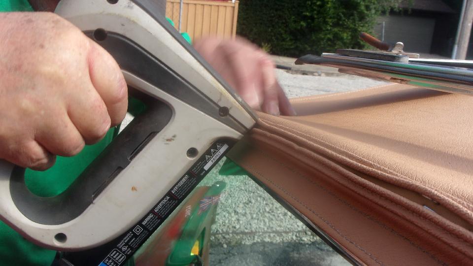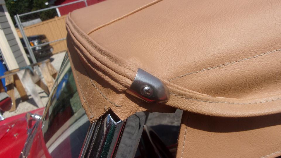 Since we were sitting where we could plug into power, it was a good time to finish installing the Hidem strip on our new convertible top. About the normal amount of fuss we were expecting. Start in the middle, open it up, align the bottom edge, pop in the first staple, and continue working out toward the sides. A bit finicky deciding how to align the ends with overlap on the side flaps (this time), and installing the chrome trim tabs with small finishing screws.