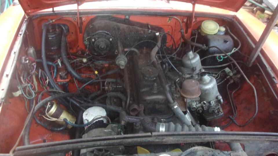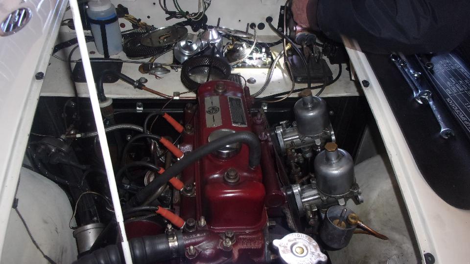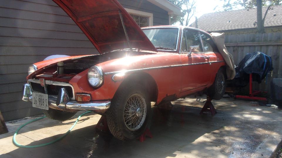 Here is a look at CMGC's latest project car, the MG-MGB-GT. Late enough to have fuel vapor recovery, but before rubber bumpers, and I think I see an anti-run-on valve, so 1973-1974 model. It was a very good engine with the "L head (1972-1974) for higher compression and better breathing.