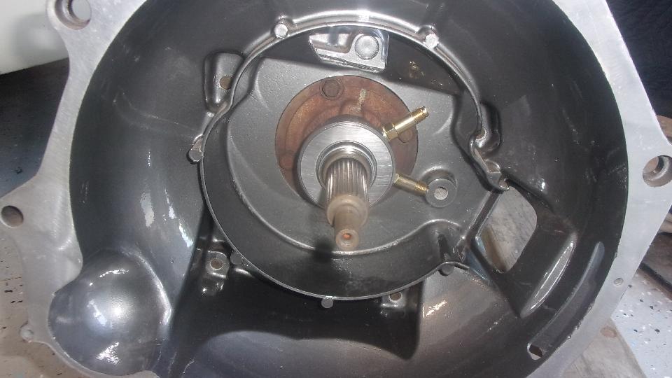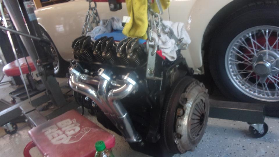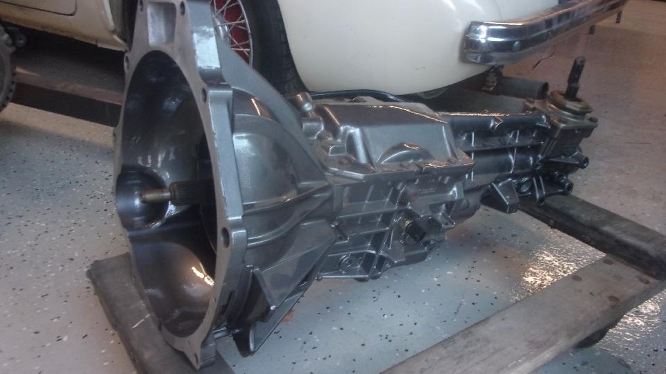 For something a little more enticing, this is the new V6 engine and T5 5-speed gearbox (think modern Chevy Camaro). This is destined for Tom's latest MGB restomod with all of the go-fast parts. Love the exhaust headers, gotta find our who did those. Powder coated gearbox and coaxial hydraulic clutch release bearing. Will be a challenge to pin the bearing housing so it doesn't rotate, and properly anchor two hydraulic hoses for input and bleeding outside the bellhousing.