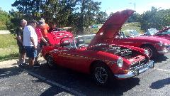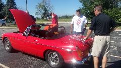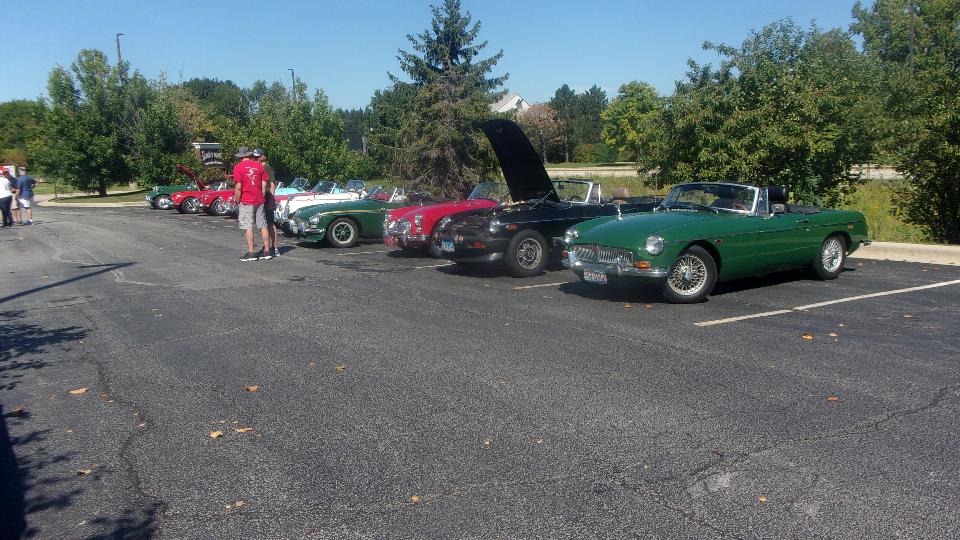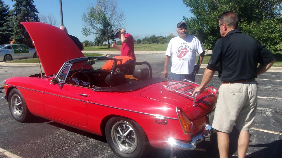 Attending the Tally Ho Rally, a gimmick rally presented by Vintage MG Car Club of Chicago, with invitation to Chicagoland MG Club, so it is an official club event for both clubs. They do share a lot of events. Beginning and ending at the Lucky Monk restaurant in South Barrington, IL. First up, a new car in the club, recent acquisition by a long term club members Russ and Amy Mehaffee. It is a nice mid production MGB, converted to a Weber downdraft carburetor.