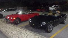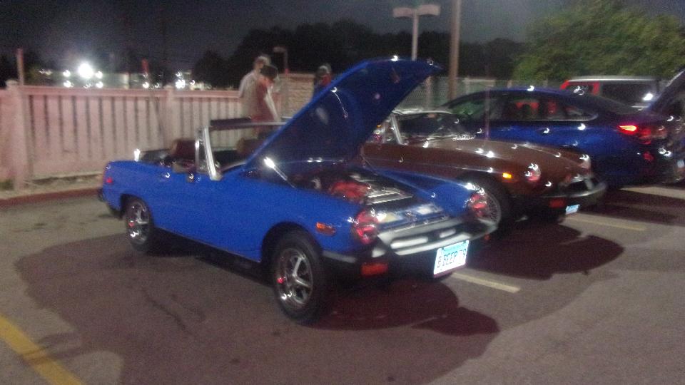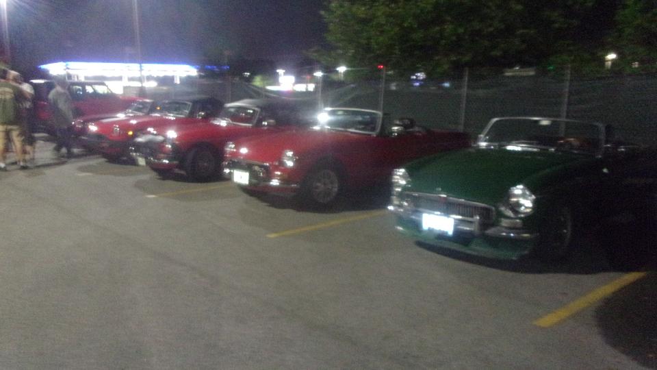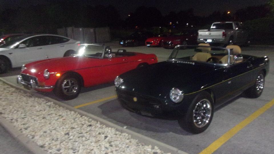 Monthly club meeting for Chicagoland MG Club tonight at Mr. Beef and Pizza in Mount Prospect, IL. We arrived early for dinner, not very many MGs in the car park yet. It got downright crowed by meeting time, maybe 38 people to fill the room, including a few standing in the rear. Mid meeting break after most of the formal business, so out to the car park to kick some tires. Hard to get pictures in the dark, but I think there were 12 to 14 MGs with more family haulers mixed in.