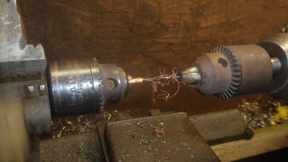 Mount a small Jacob's chuck from a hand drill in the 3-jaw chuck of his lathe, and an even smaller Jacob's chuck in the tail stock. With the copper tube rotating and the drill bit stationary, the 1/4-inch deep clean out drill hole only takes a few seconds. As a quick way to deburr the other end of the tube, just use a 1/16-inch drill bit and run it all the way through. Short work, and stash the bits in the Magic Trailer for future reference.