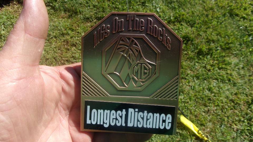 As we were all waiting for awards announcements, my name came up for the long distance award, again. This may well be the same one I received last year at this show, because I did the same thing again, took the picture and gave it back to let them recycle it again next year. I also picked up a door prize (most people did). I don't usually wear advertising, but I can always use another T-shirt, and this one is kind of cute. Last picture is the MGA class winner showing off his new award to go with his real four-wheel trophy. The Darrell's Garae guys snagged the club participation award again (as usual) for having the most cars entered from a single organiation (even more than the host club apparently).