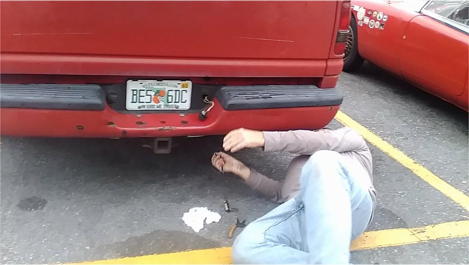Start the morning off with a good deed for the day. A Dodge Ram pick up truck had a plastic shell tag lamp falling out of the rear bumper. after the snap barbs broke. My tricks bag came up with a small self tapping screw and matching fender washer to save the day.