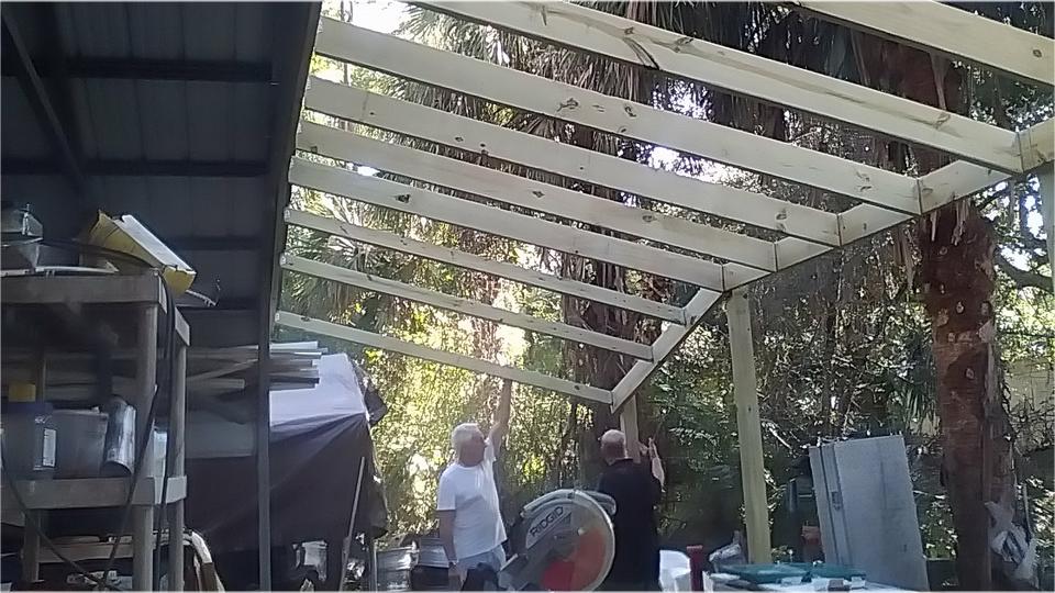 Guys were working to rebuild a rear portico the blew down in the last hurricane. The prior one was coarsly corrugated translucent white fiberglsss over sparsely spaced 2x2 framing. That was better than the earlier one made of bamboo with thached roof that only lasted a year, but still not up to a good blow. On the other hand, it was attached to the back of an outdoor framed tent that is still standing, so waddaya expect? They're just trying to get some shade in the summer months.