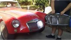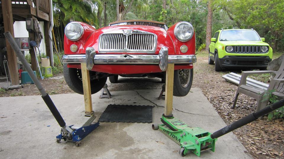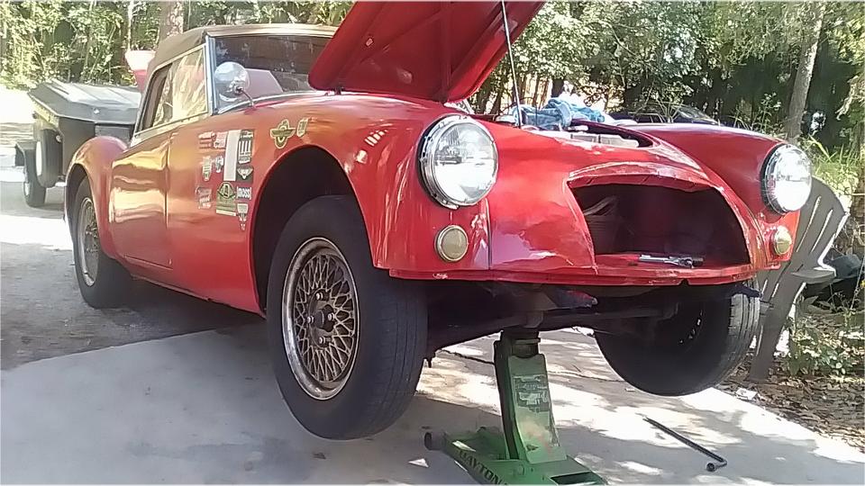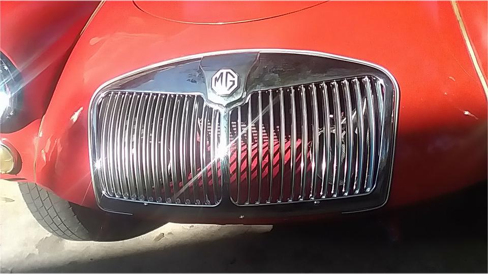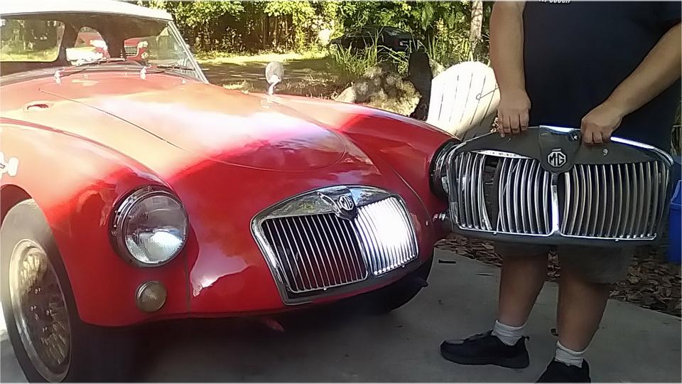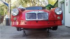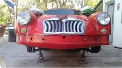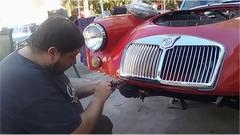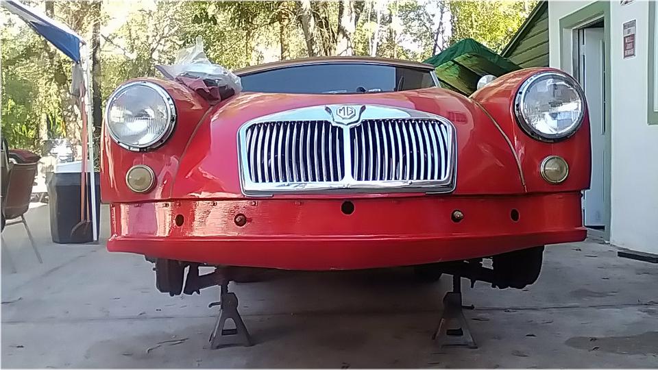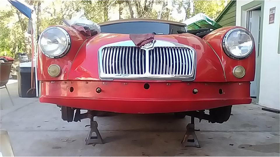 Meanwhile we moved the MGA into the shade and jacket it up again when we went to work cleaning threads before installation of the front valance and bumper. Easy enough to install 14 screws to attach the valance panel.