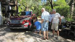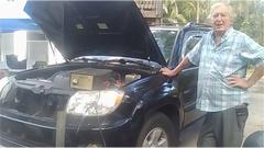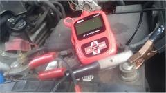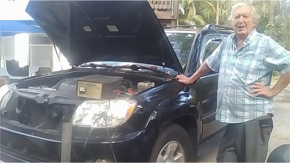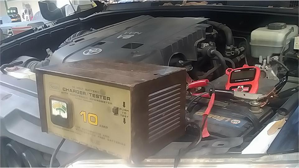 The big Toyota was still here and still blocking our preferred shady work space. Its battery was still discharging while sitting overnight. Not sure if it is a bad battery or some unknown power drain while parked. So get it back on the charger, and ante up my little red battery tester. Check back later once it is fully charged.