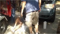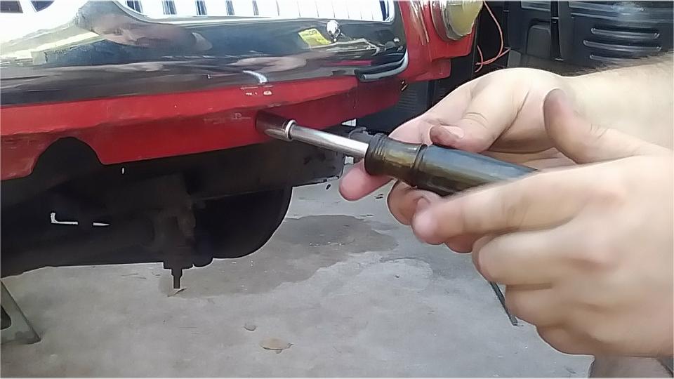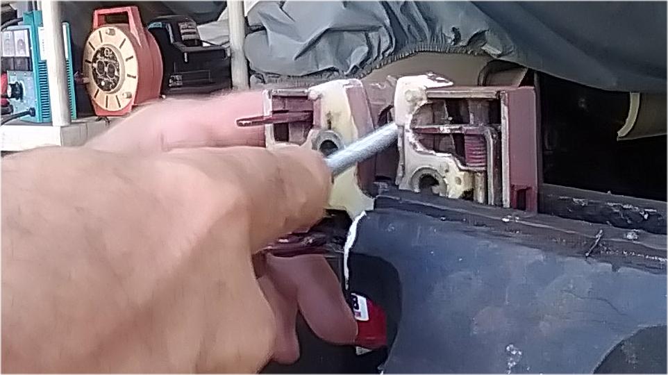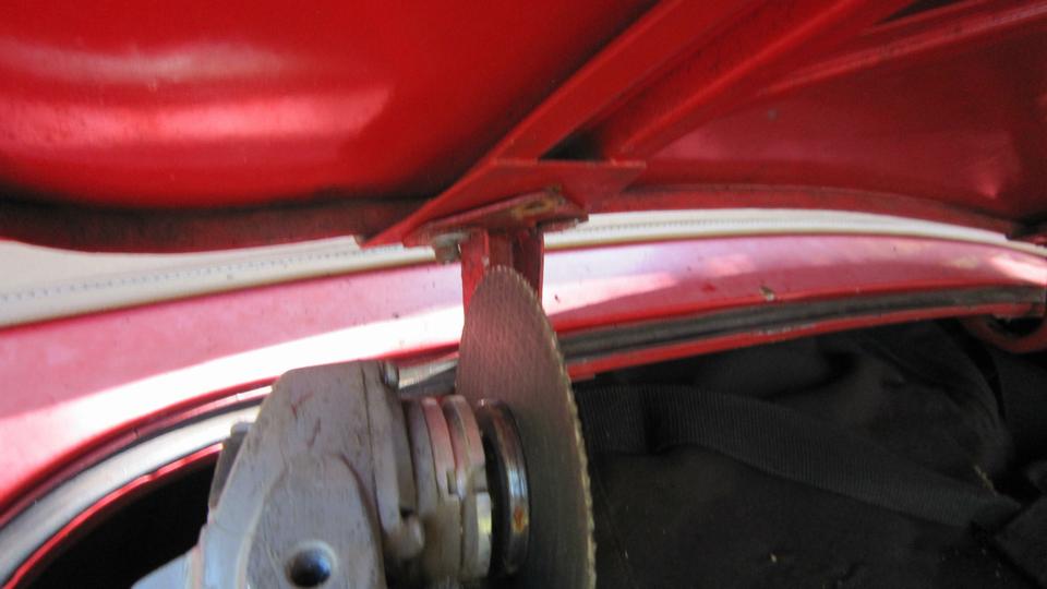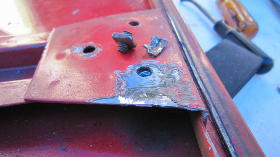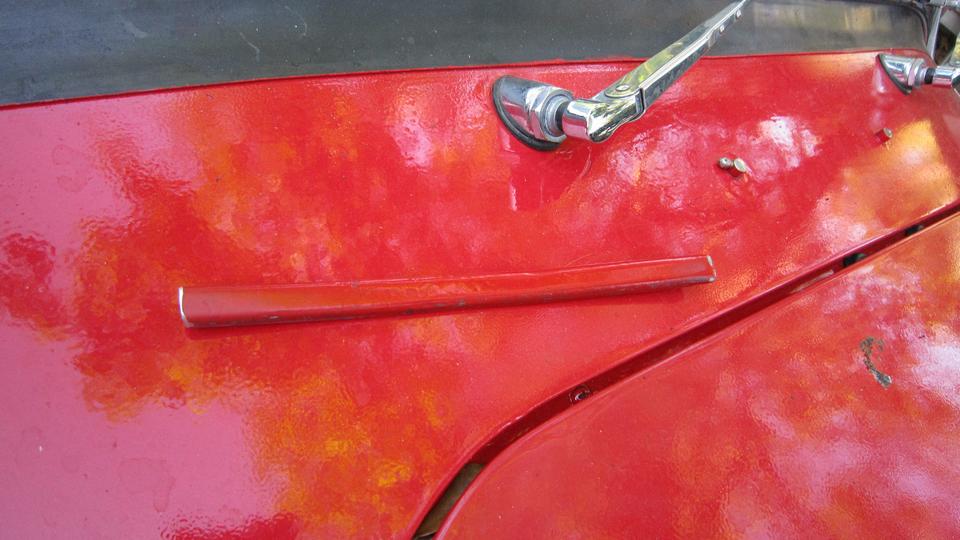 The ding on the trailing edge of the right side door was leftover from when a hit and run truck and trailer clipped it in California last summer, so get out the hahher and dolly to fix that. We were removing the boot lid to remove the "MG" octagon emblem before repainting. One of my quick-release thumb screws was stuck and stubborn, so I ripped off the plastic cap and went after it with an Allen wrench.