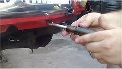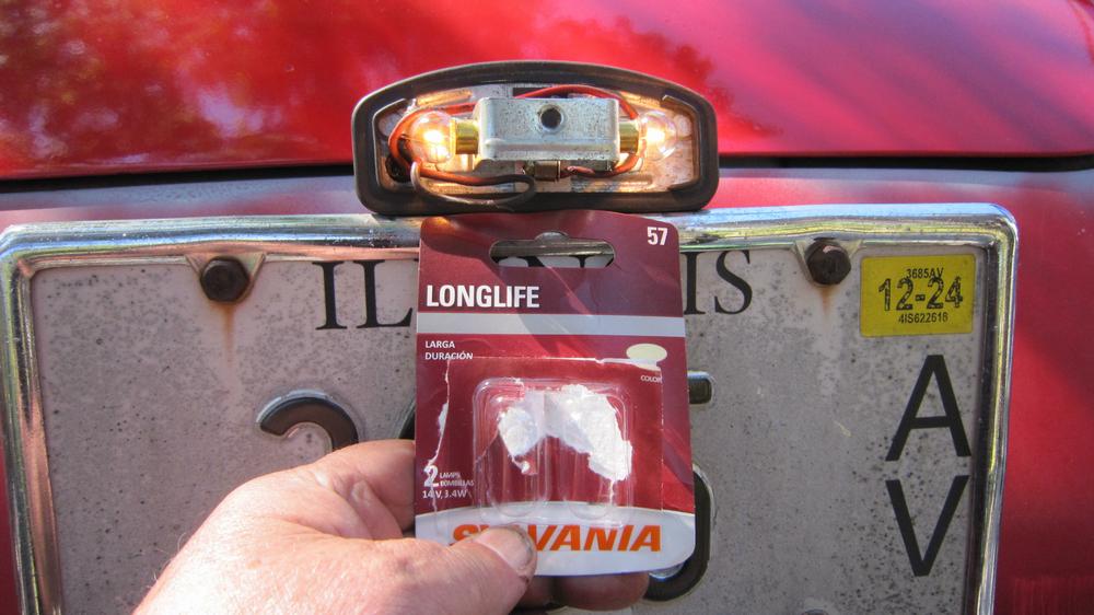 Did a bit of shopping last night and this morning, so we can do this. Yesterday's internal B-pillar panel replacement got a coat of red, courtesy of a spray can of Rustoleum. Color name on the can is Sunrise Red, and available at Walmart no less. Go figure. Easy to match touch up paint now, for a while at least, but only for my car. It looks like a fairly close color match, and I bought it for less than $10. Very handy in aerosol form, and good enough for hidden panel repaints. Before removing the rear bumper, replaced the two bulbs in the rear tag lamp, one of which was burned out and the other heavily silvered and close to be following.