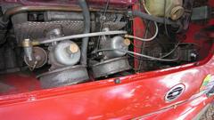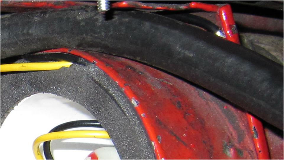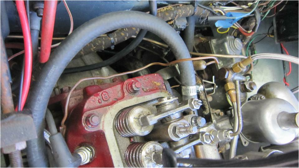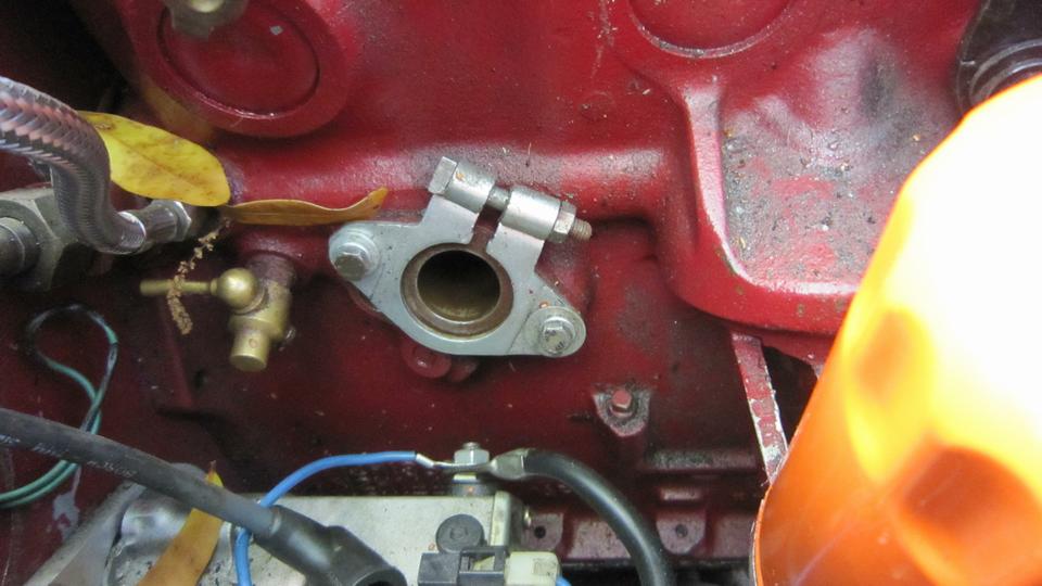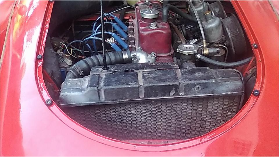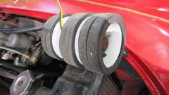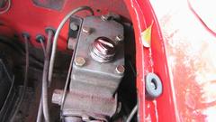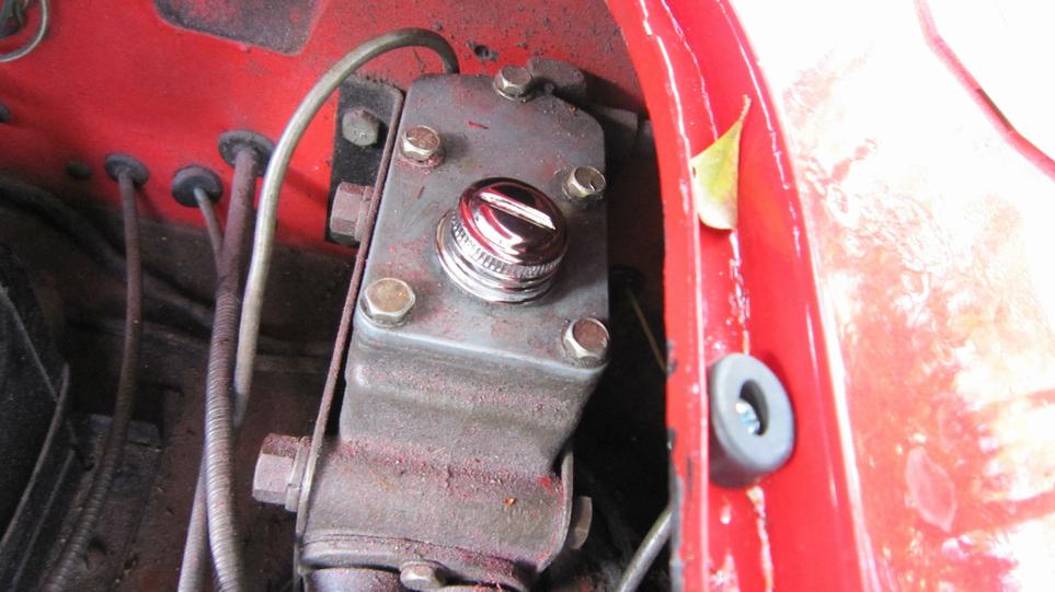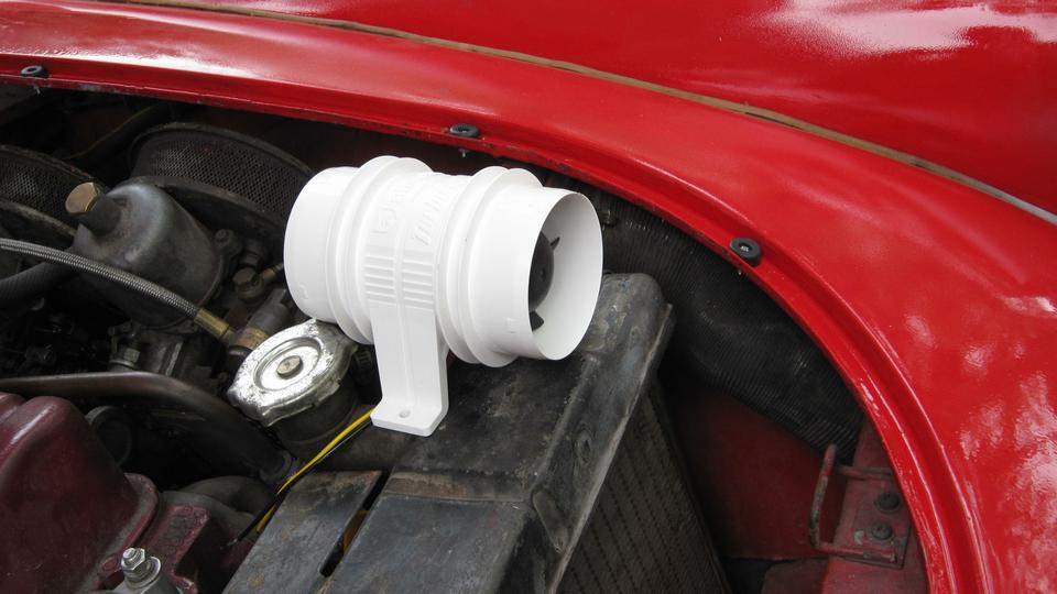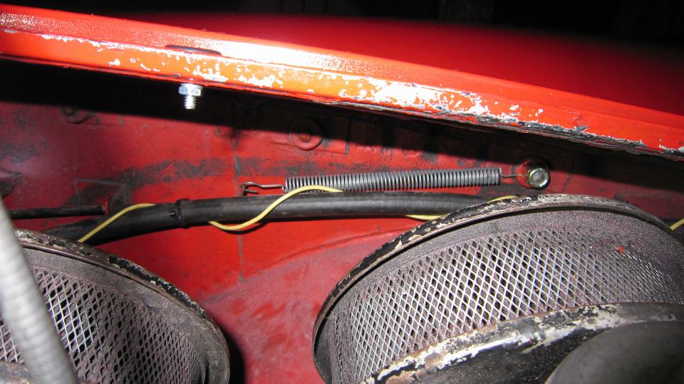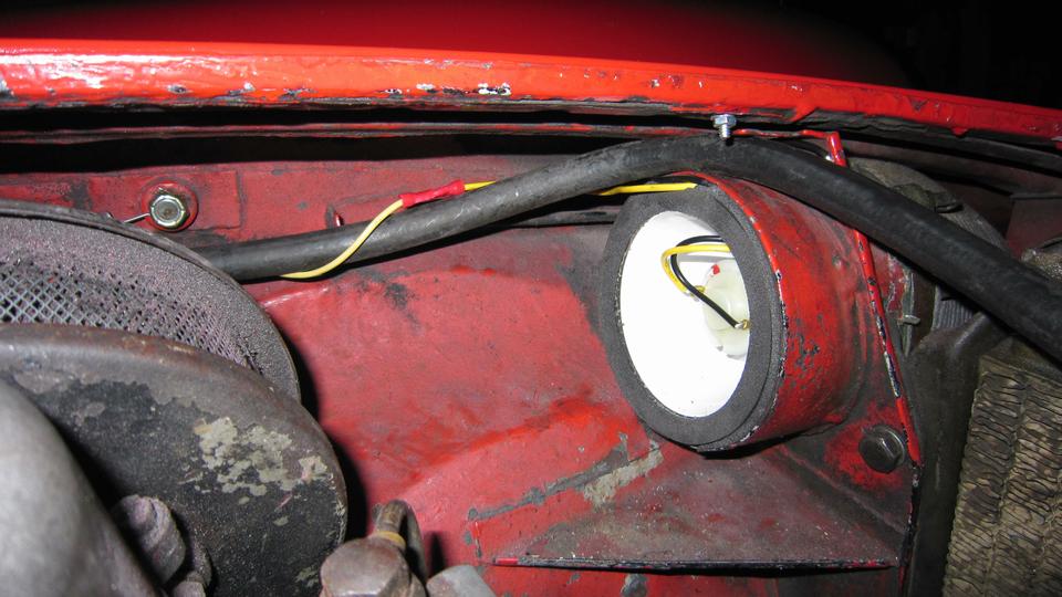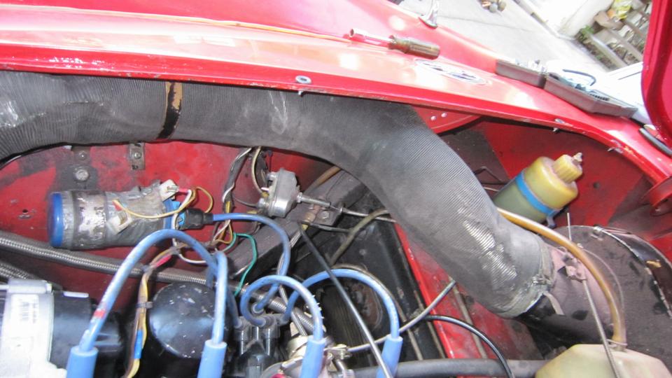 Stuff it firmly into the air duct immediately forward of the carburetors. Ground the black wire locally on a sheet metal screw (almost hiding behind the coolant overflow hose at upper right). I ran the power wire along the coolant recovery hose (which goes back to an overflow bottle on the heater shelf). At the heater shelf the wire runs past the outboard side of the master cylinder, and through the bulkhead rubber grommet with the speedometer cable. The recovery hose and the wire are tie-wrapped to the bonnet release draw rod. Yes, I know it moves when pulled, but it has been working this way for 10 years, and this is another new wire and rubber grommet. While we were tinkering around there, I also installed the draw rod return assist spring (which had never been present since I have owned the car).