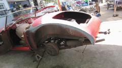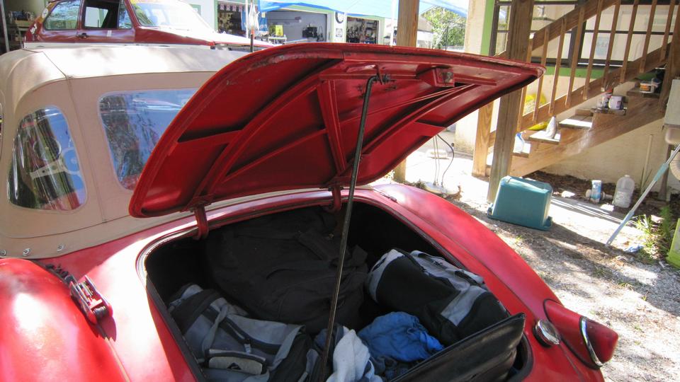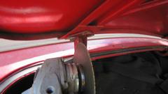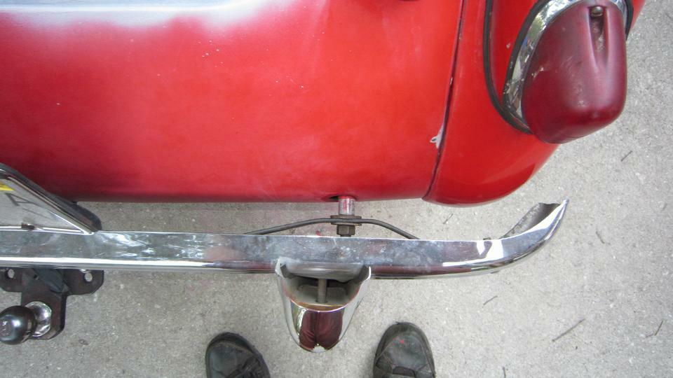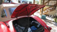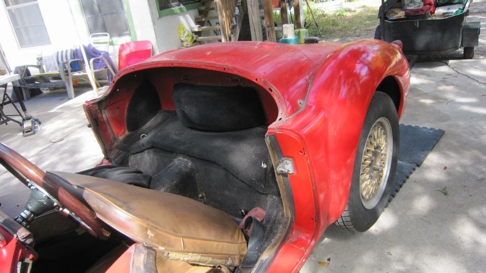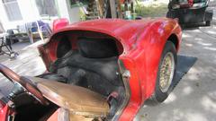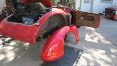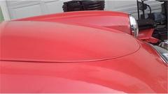the outside. I will tuck the wing into the shut face flange and hold it while he was to install two bolts underneath, without touching the fresh wet paint. It took a little encouragement, but he finally did. Leave the bolts loose please. Oh, and also two more small bolts each side for the tail light plinths. The rest was back to normal. Install the tail lights and bumper, tear drop hooks for the rag top, and the boot lid (with gasket). Put the top up and side curtains in, put the wheels on, kick it off the jack stands, and lets get out of here.