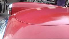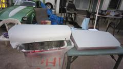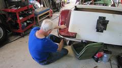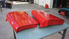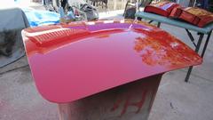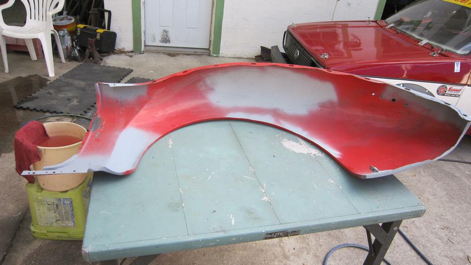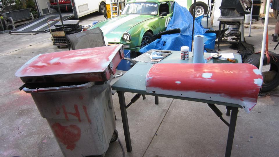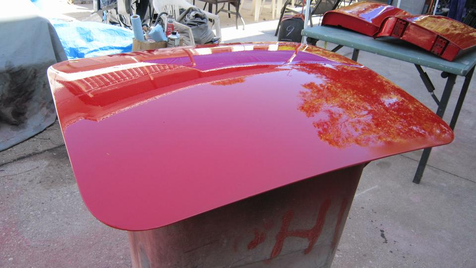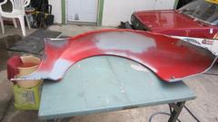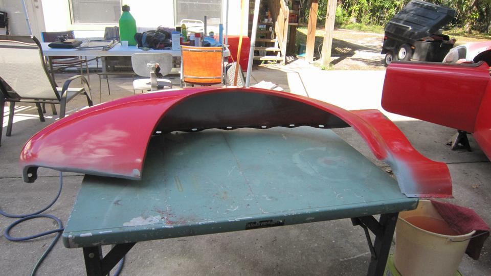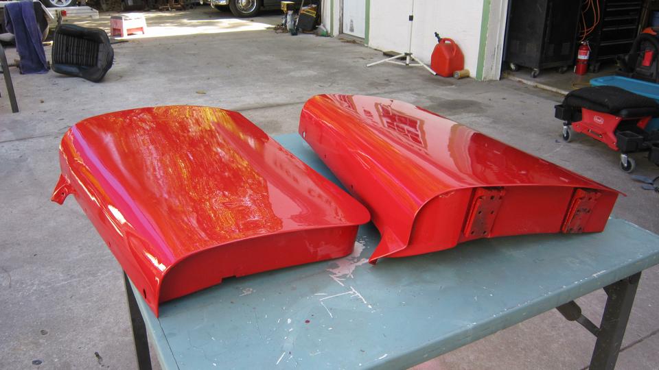 rinse down and blow dry. A little more vigorous 500-grit wet sanding on the boot lid to remove old oxidized paint surface, then rinse and blow-dry. All three panels sprayed red by noon, as planned.