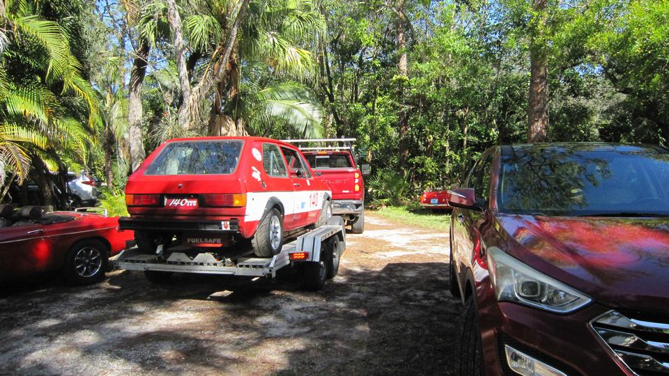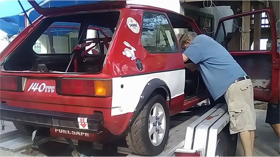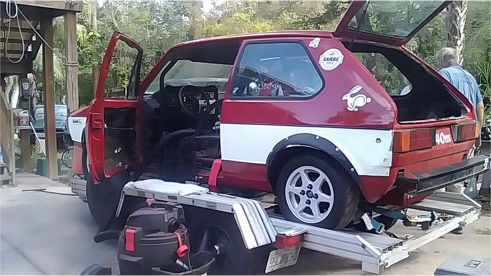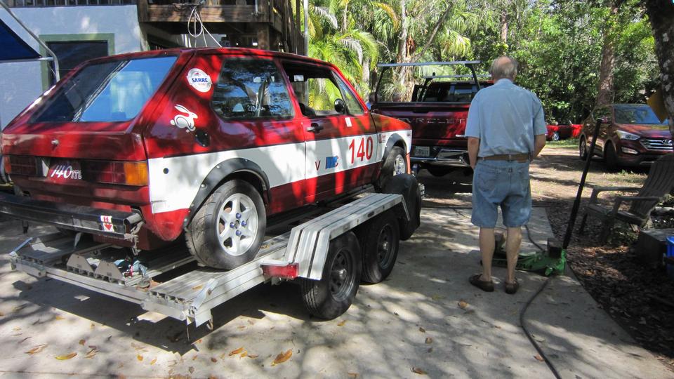A short pause to move a few cars around to get the racing Rabbit out of the shop and onto a trailer. That was heading from Bonita Springs to North Napels for a quick tech inspection before next race date. It was back in an hour with smiles all around.