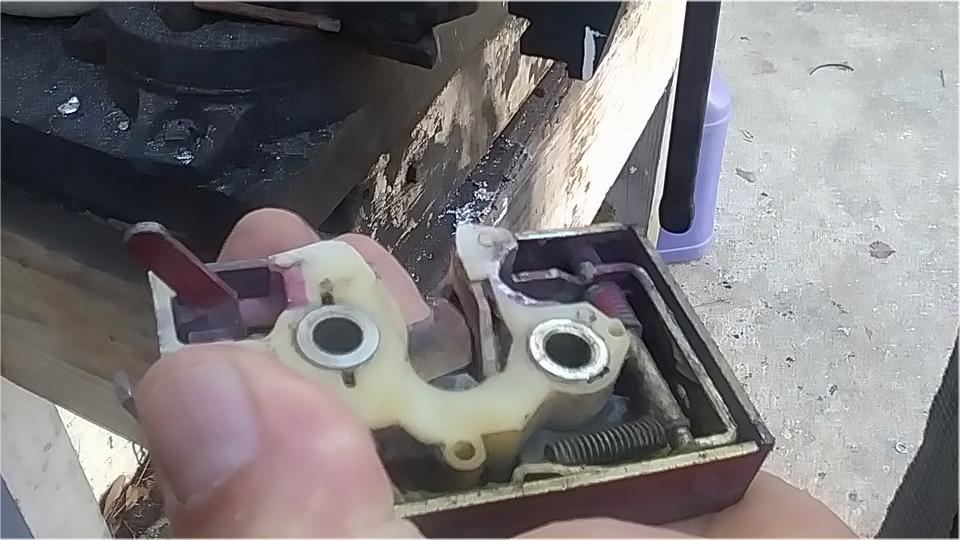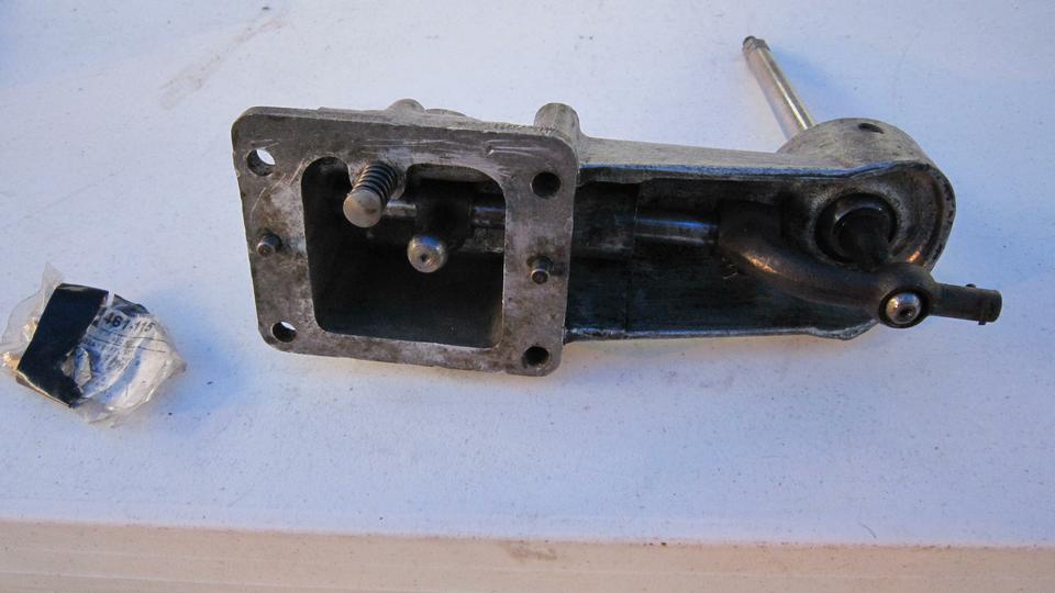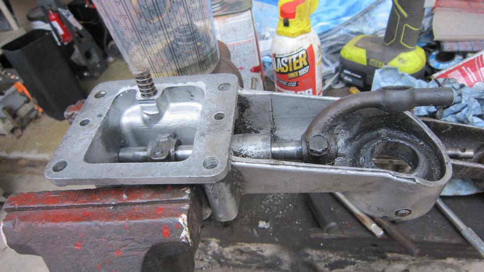 For the final assembly I used the housing and two levers from the crusty beast, the shaft and hand lever that came out of my car. I had a new split bronze bushing that I bought from Moss Motors two years ago as a spare part, but that didn't fit, having too-small spherical inside diameter. Well, when I swap this Frankenstein assembly back into my car I can "borrow" the bronze bushing from the loaner assembly I picked up in September (but need to return). And I know where we can get new bronze bushings.