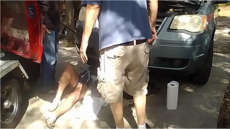 Amy Vandivier had sold her MGB, so her mini van was now used for daily service, and it needed an oil change. She was under there working the drain plug and filter change when the large oil drain pan got bumped and dumped lots of oil on the pavement. She got soaked, but carried on to finish the job. Brave lady, working on her own cars (when needed). I got to help with the clean-up (don't ask) -- John Shoemaker was busy with wiring for the overdrive and reverse light switches on his ZB Magnette.