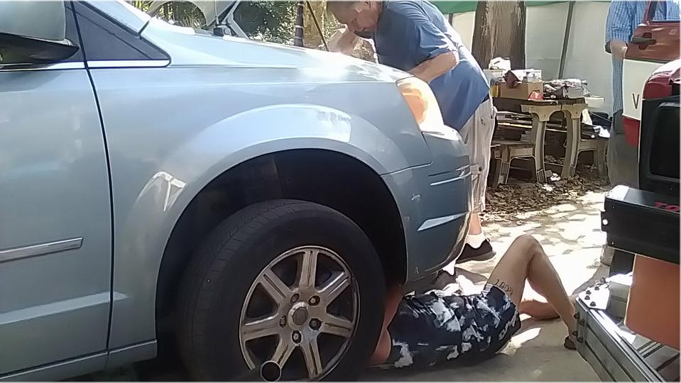 Wet paint still on the front valance panel, and we were losing the day light. so it seemed like a good time to quit, and attend to the front bumper another day. Wheels on, jack it down, pack up tools and clean up the place before heading for dinner and WiFi.