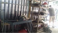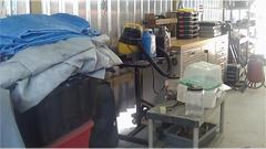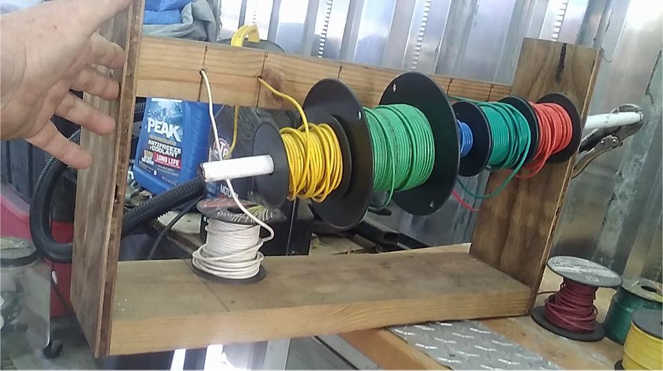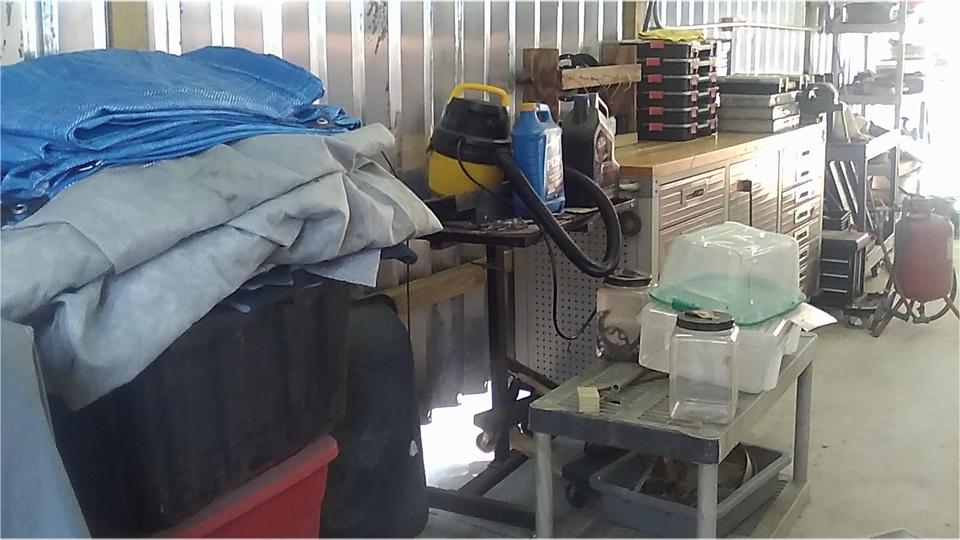 More improvements in the back patio with the new portico cover. The whole rear wall is now lined with equipment and tools, and it appears to be limited double parking in front of the work bench (needs more consideration). The spool wire dispenser was getting a touch-up, the tubing axle being too tight for easy service. A new shelving unit was being cleaned up, moved in and out a few times, and the guys were already fighting over the shelf space. No junk allowed! Try to keep this place in order (for a change).
