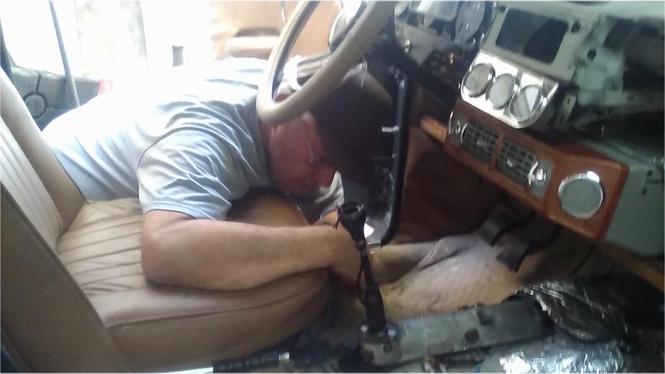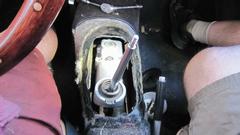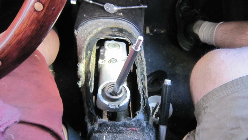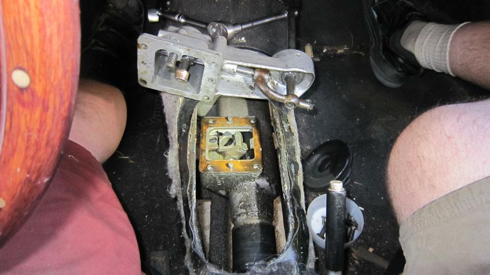 Then we proceeded to R&R the gear shift extension assembly, so we could return the loaner part to the owner in Oklahoma. Remove shift knob, tunnel center carpet, rubber boot, and the tunnel cover (eight #10 screws). Remove four bolts and lift off the shifter extension assembly.