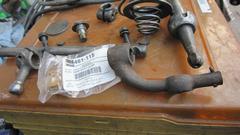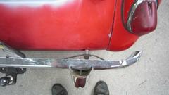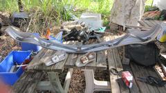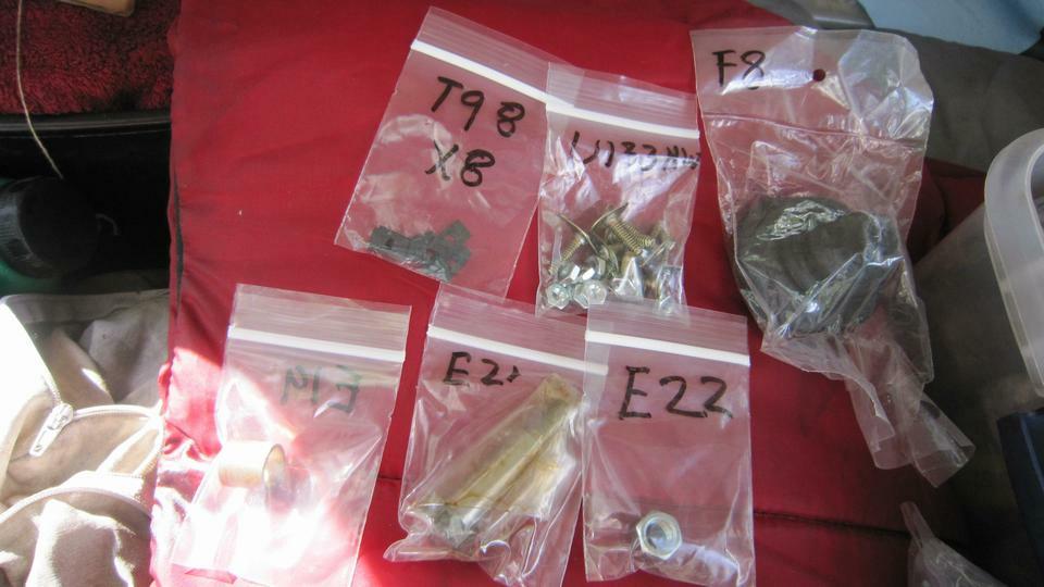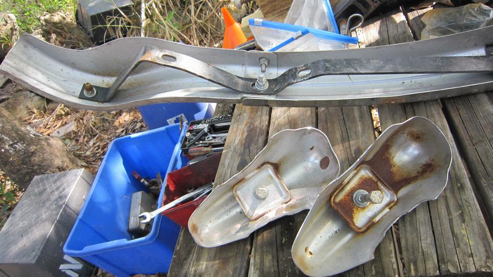 Late start at 11-am, but nice working weather, warm enough, and overcast to begin, shed the sweat shirt. Main task today is to install the front bumper. Having done this several times before, I was hoping for no more than four hours, but it might be more after the4 body smash and repair. Lay out the goodies, and first reinstall the overriders we removed four weeks ago. Moss parts, new 2-1/2 years ago. The face bar is reasonable, having been painted inside. But the overriders are badly rusted inside. I wonder haw many people might toss them out after one year outdoors.