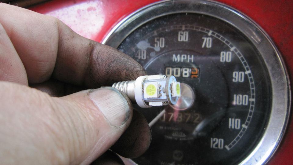 Along with (and after) all the pains of crawling under the dash and steering wheel, it was easy to replace another failed LED with an original type screw in incandescent bulb for speedometer illumination. I have lost track of all the failed LEDs in the dash, but certainly more than a dozen (maybe 20) since late 2014, and not a keeper in the bunch. At $5 a pop, I ain't buying any more of that type LED bulb. The standard bulbs last a lot longer and work okay, as long as the instrument case is painted white inside.